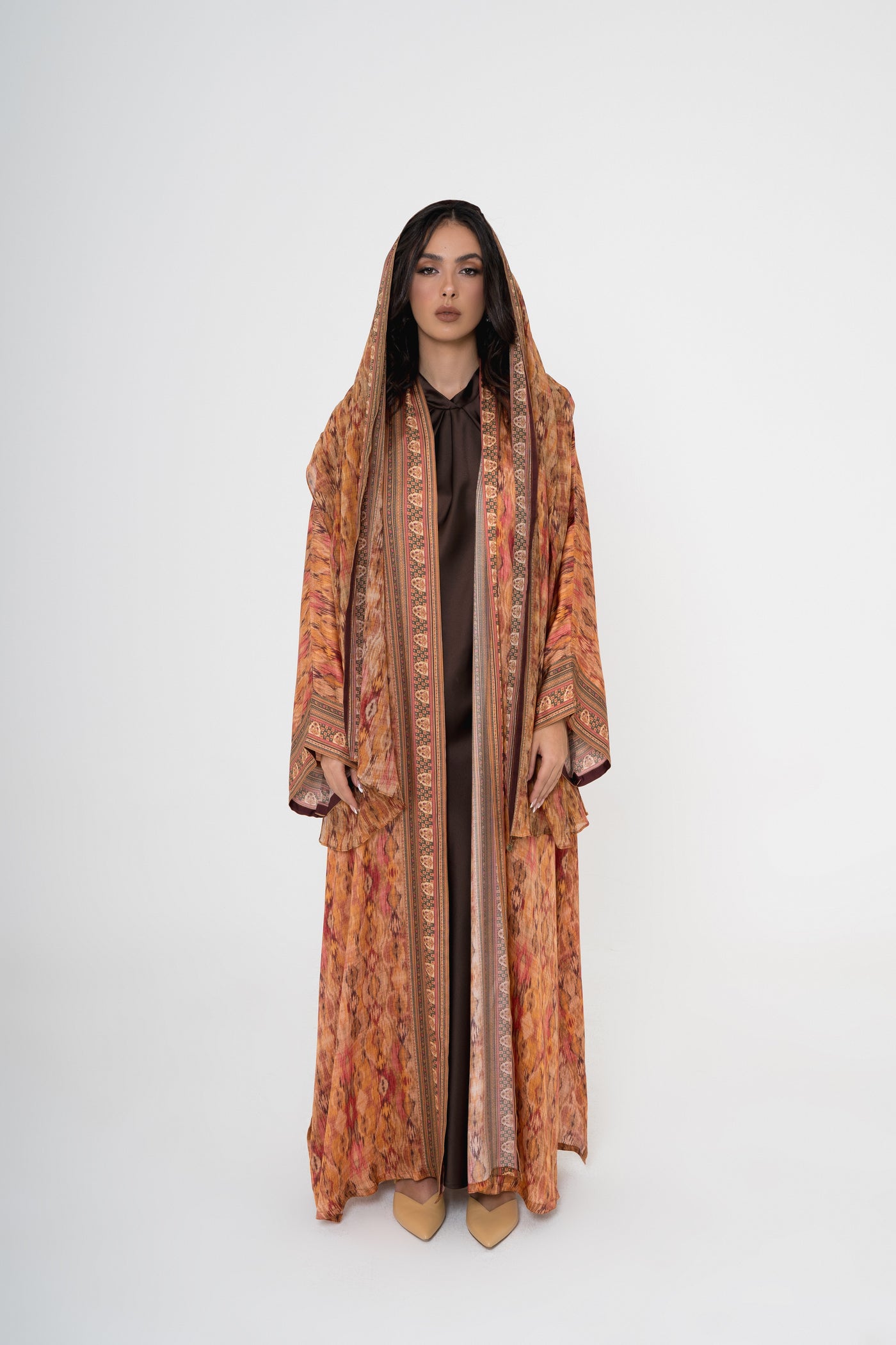 A dreamy floral printed abaya that flows effortlessly, paired with a matching chiffon Sheila. The satin silk fabric drapes beautifully, creating a fluid and refined aesthetic.