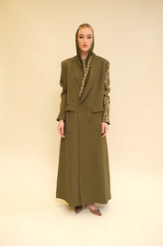 Double-Breasted Abaya in Olive Green. Inspired by classic tailoring for an elevated everyday look
