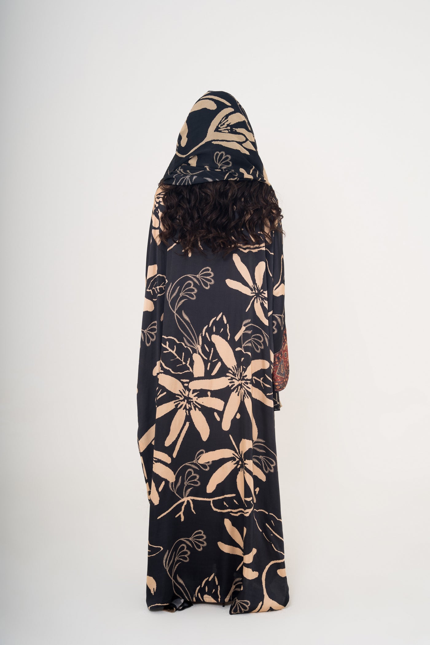A dreamy floral printed abaya that flows effortlessly, paired with a matching chiffon Sheila. The satin silk fabric drapes beautifully, creating a fluid and refined aesthetic.