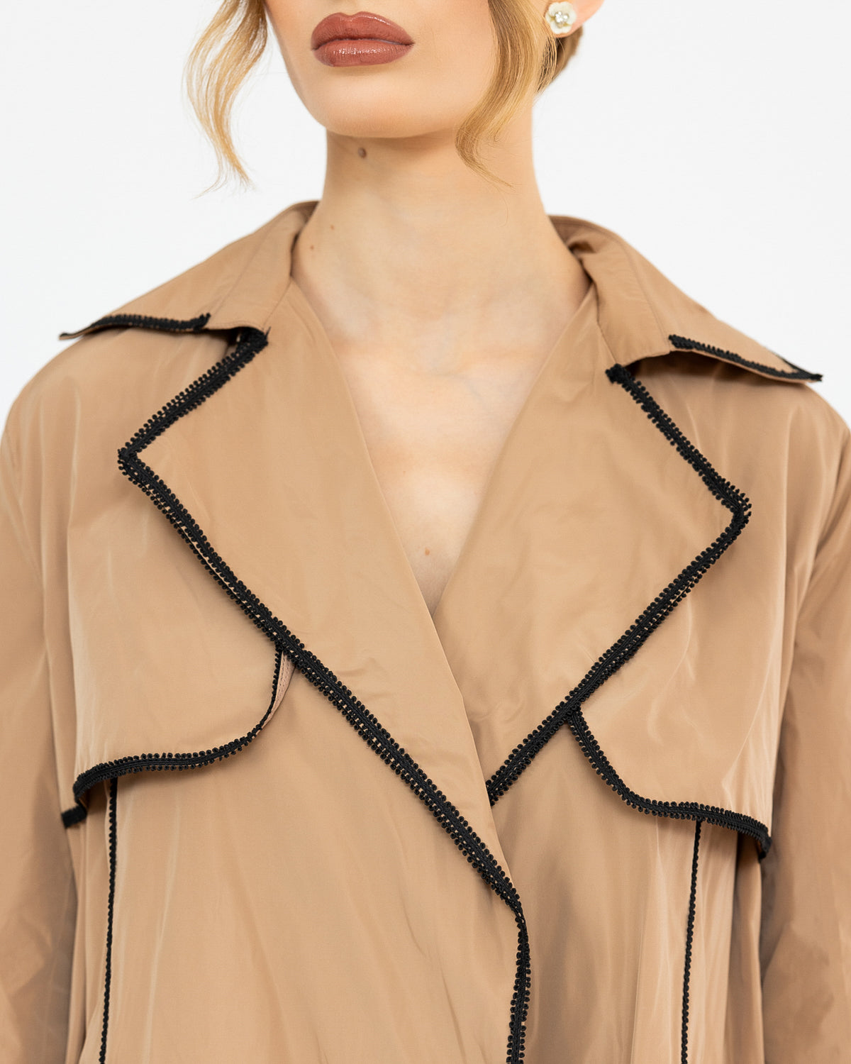 A jacket-style abaya crafted from waterproof material, detailed with lace accents for a chic and practical design.