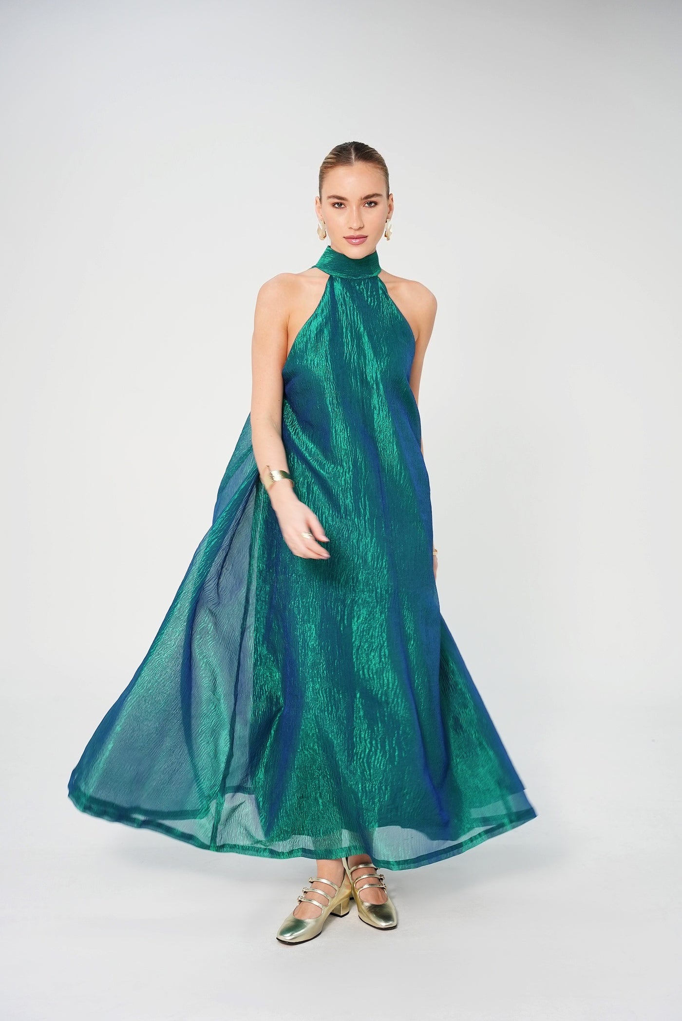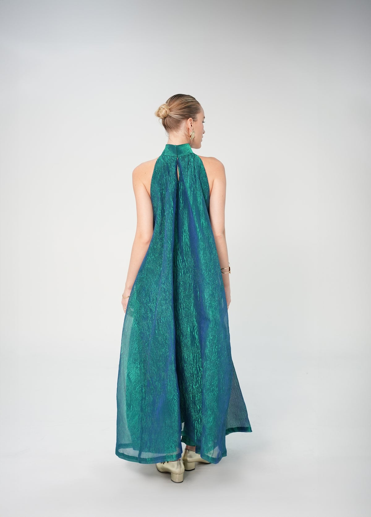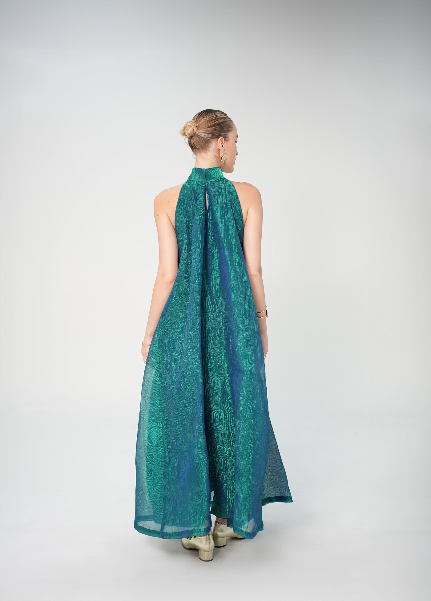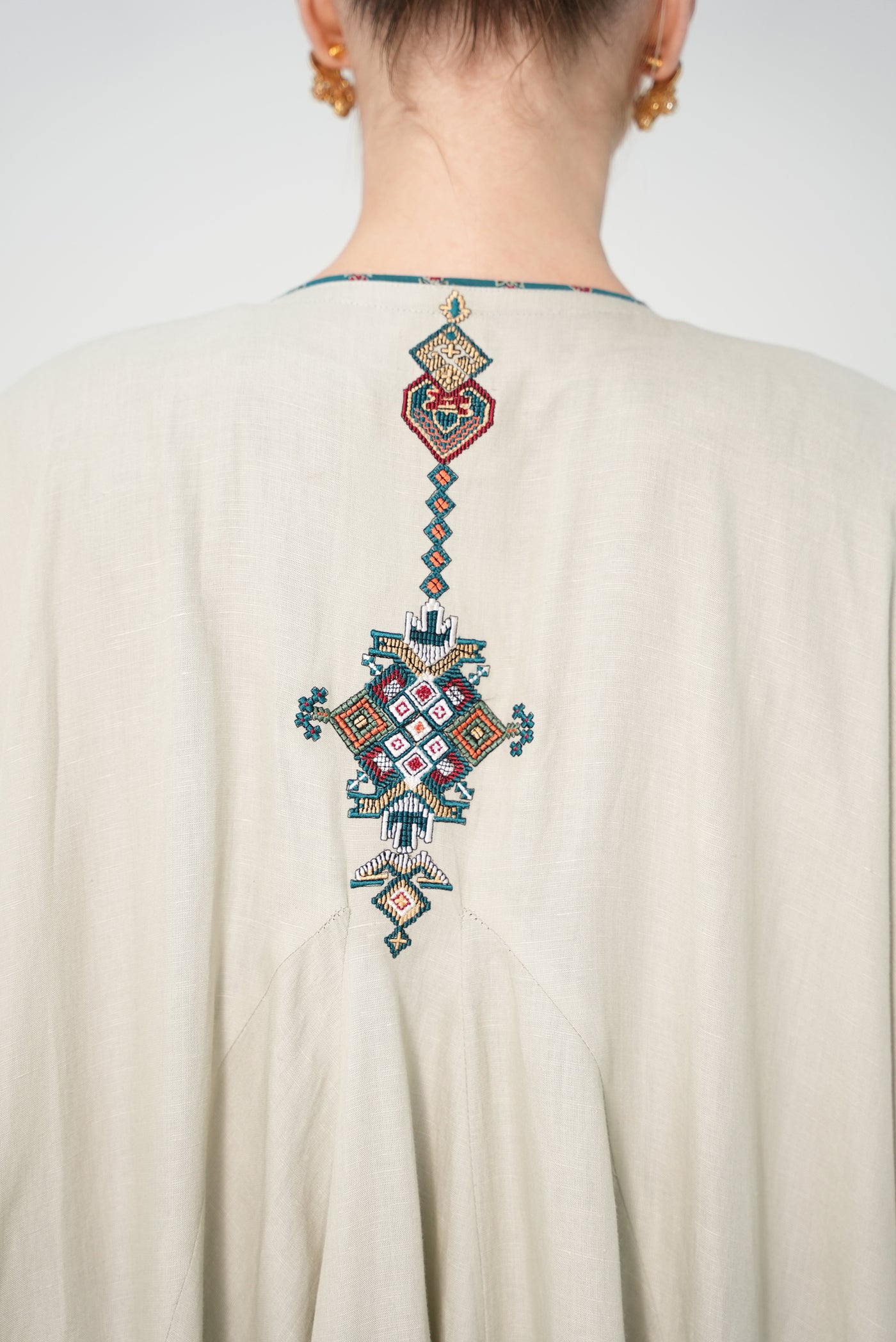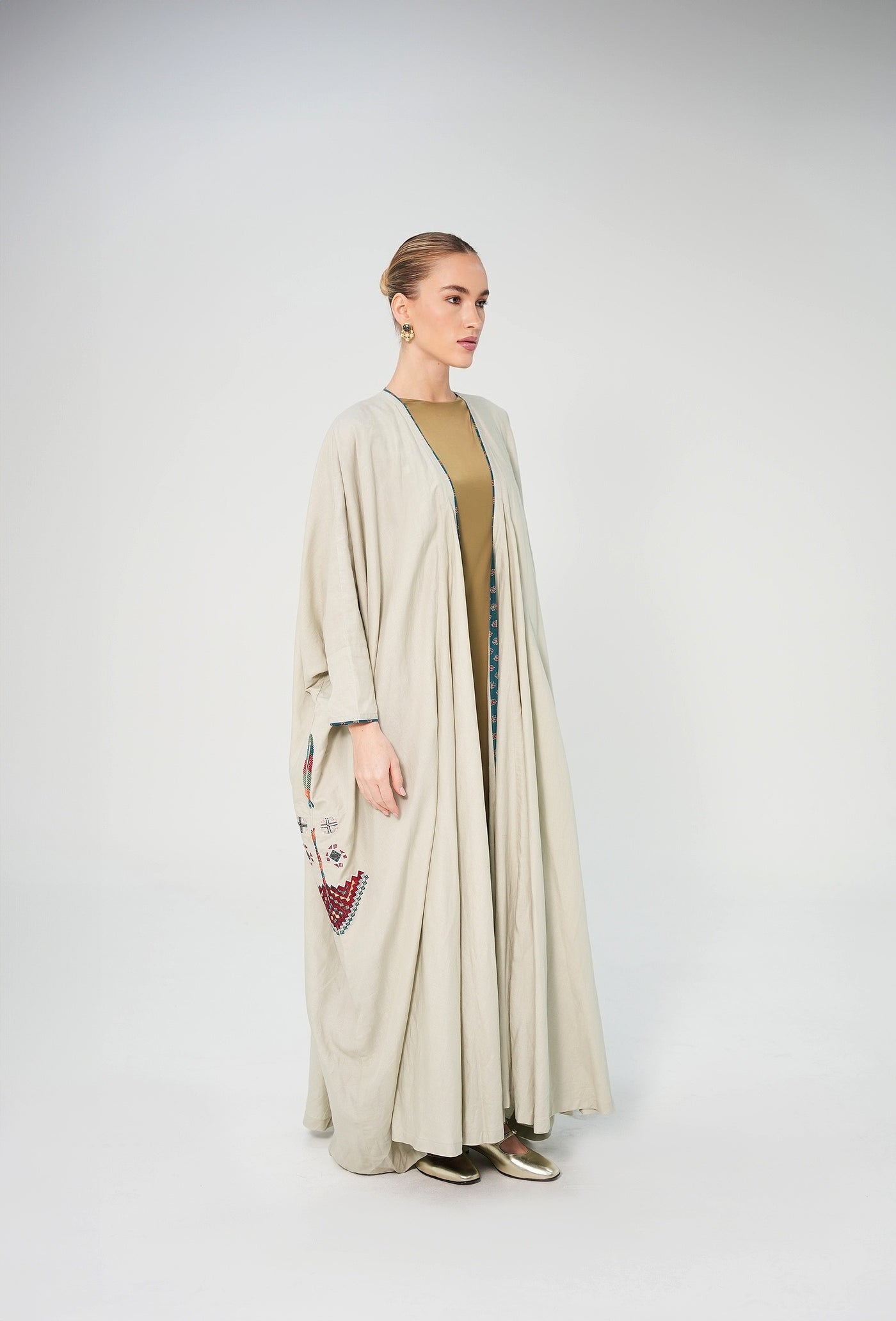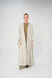 Elegant embroidered linen abaya paired with a crushed silk dress, blending subtle detailing with a soft, flowing silhouette. Perfect for a refined, layered look that exudes sophistication and grace.