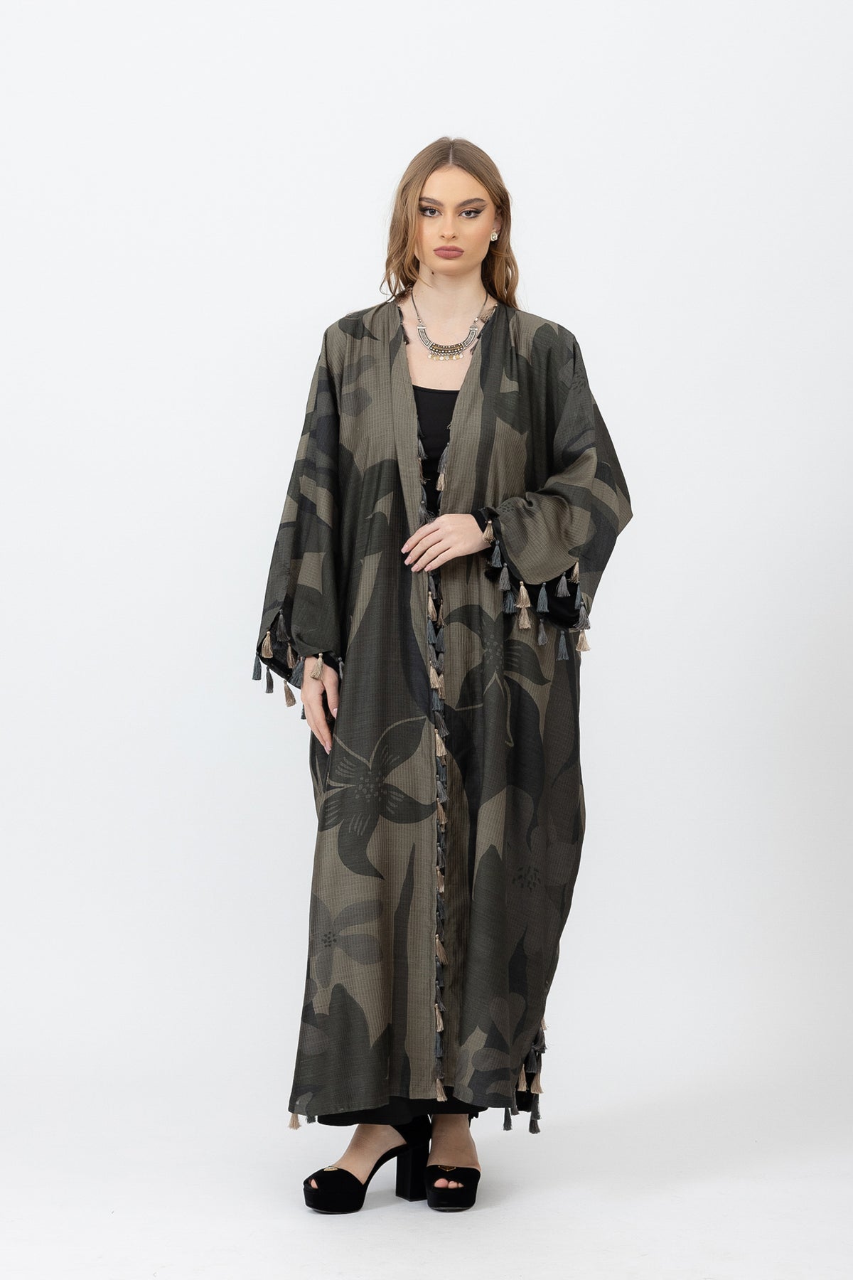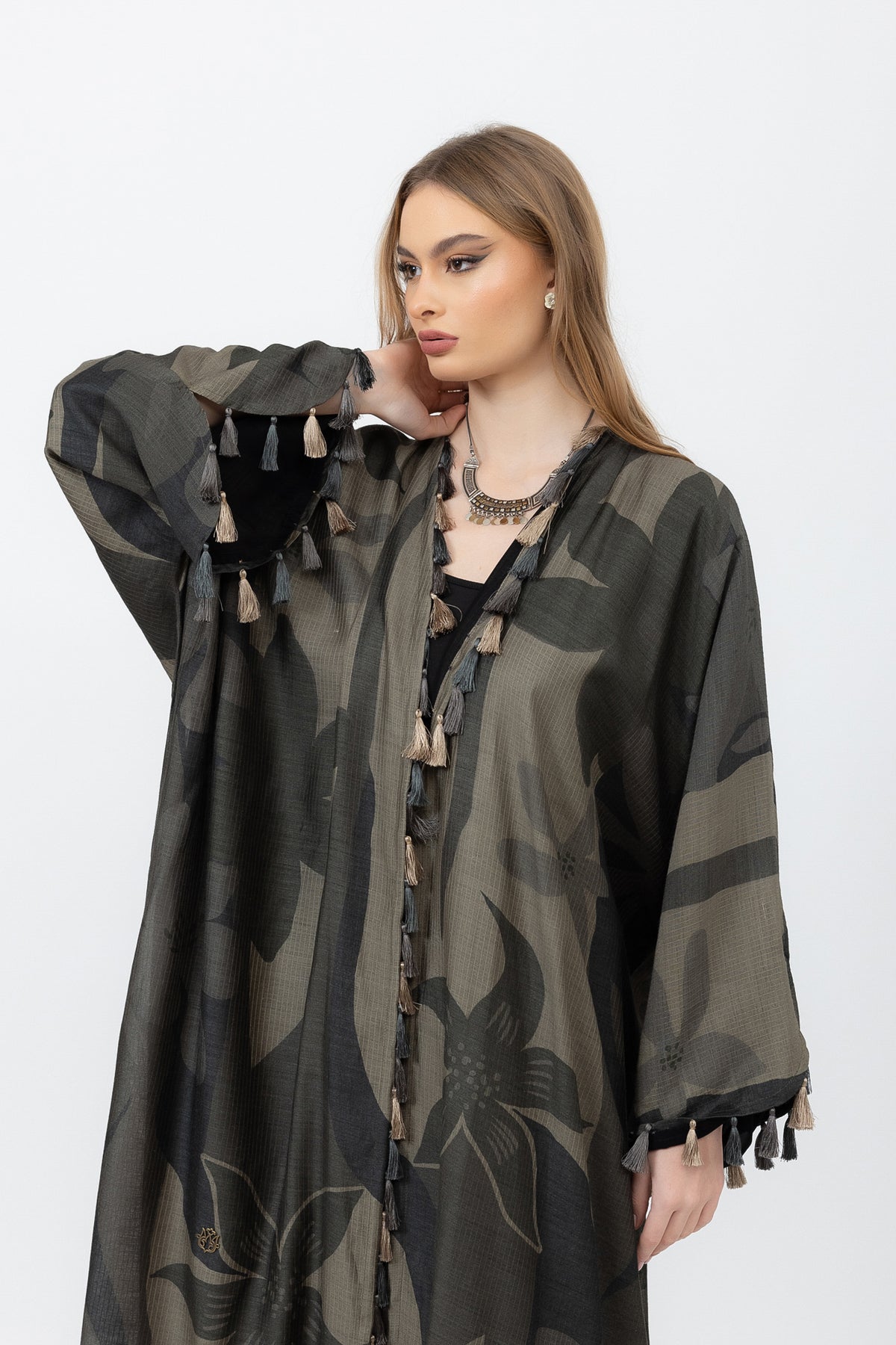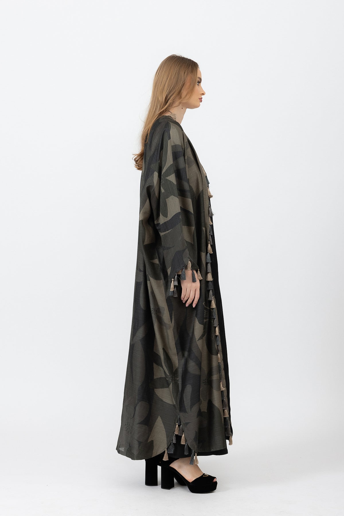 A timeless army green printed abaya, featuring tassel accents that bring a refined yet effortless charm to the piece