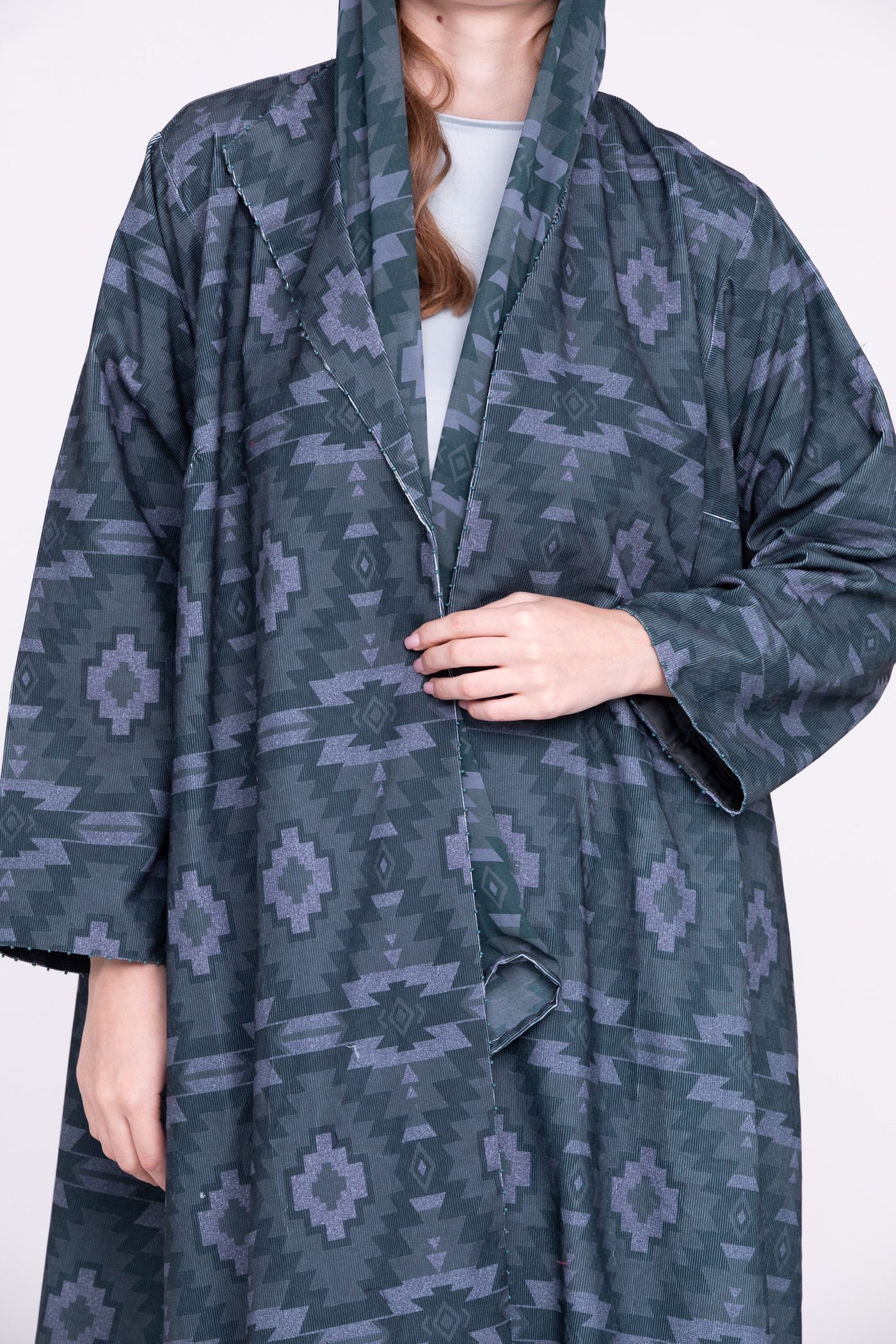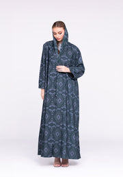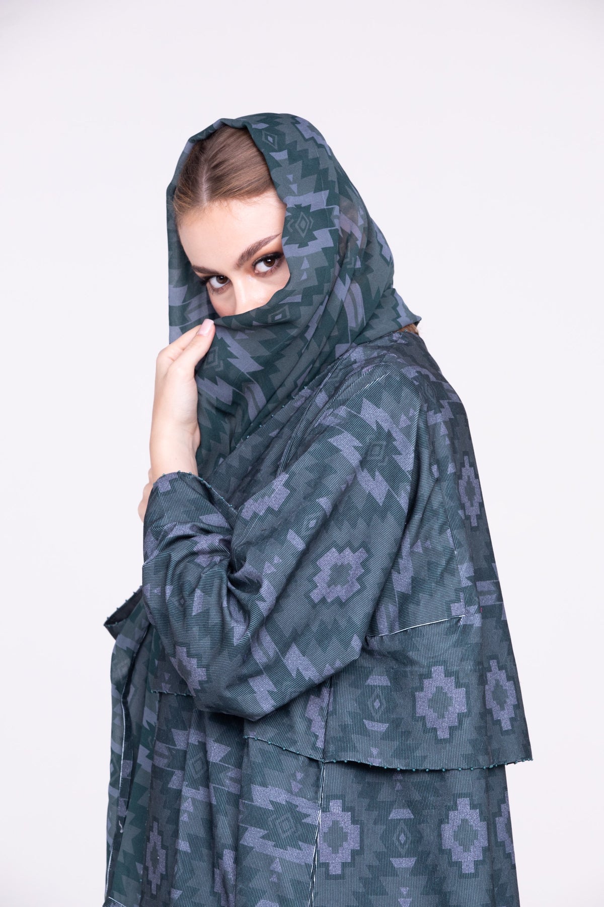 Dark Green printed corduroy abaya with a printed georgette Sheila highlighted with fine crystal bead handwork.