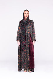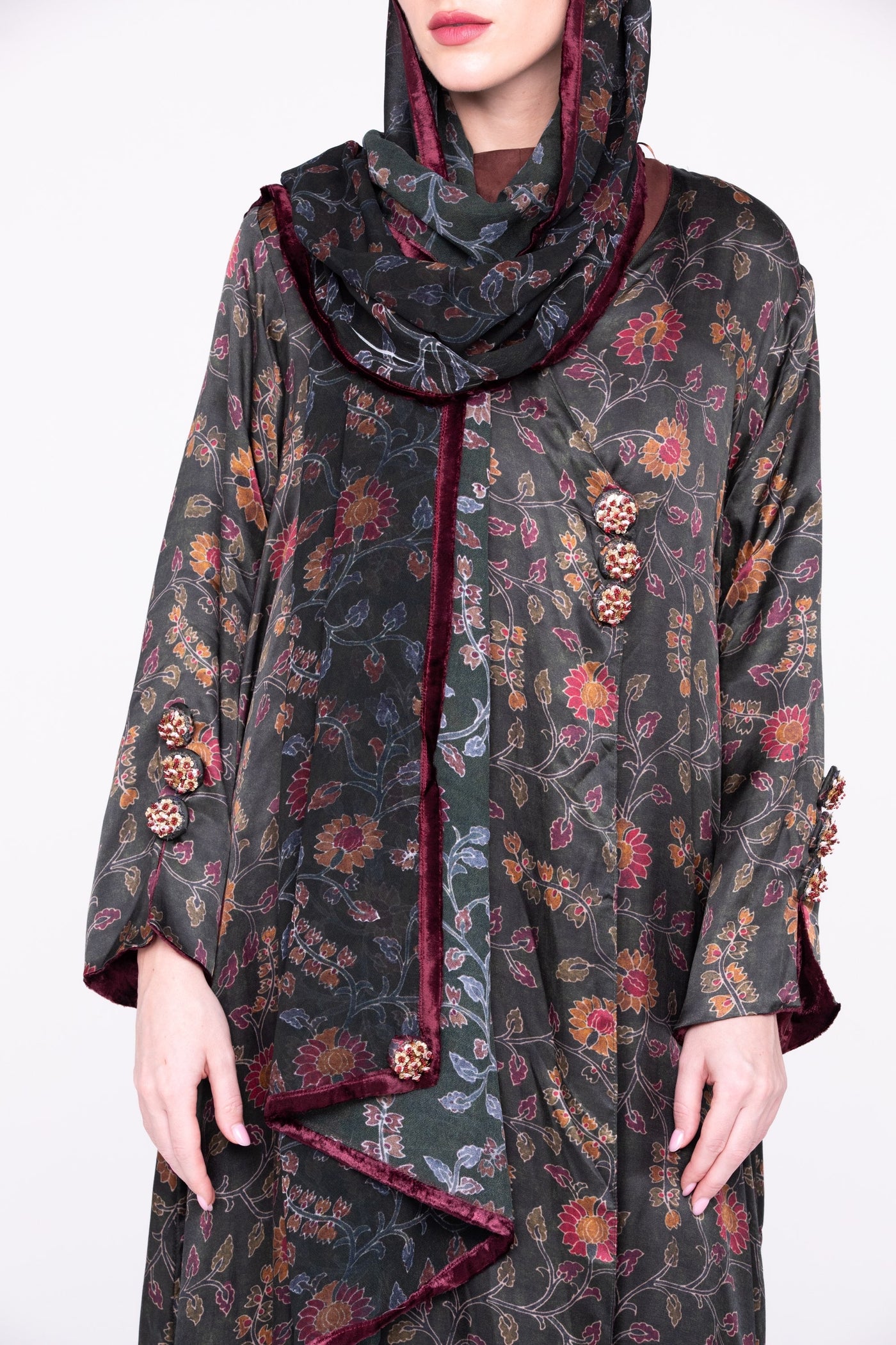 Reversible abaya with printed silk one side and silk velvet other side along with hand embroidered buttons and printed georgette Sheila.