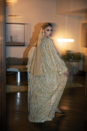 Radiate elegance in this yellow evening abaya, featuring shimmering floral sequins on airy tulle and silk—perfect for special occasions.