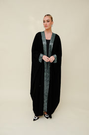 Silk abaya featuring an intricately embroidered panel adorned with multi-color beaded detailing - a true showstopper for festive and formal occasions.