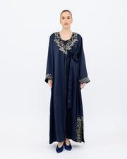 Elegant navy silk abaya featuring abstract embroidery work for a modern, refined look.