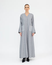 A textured white abaya offering subtle depth and a clean, contemporary silhouette.