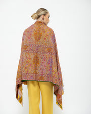Key Features & Details: Material: Made from 100% pure Pashmina wool, known for its luxurious softness and warmth. Embroidery: The detailed floral and paisley motifs are likely created using Sozni or Papier Mâché embroidery, both classic Kashmiri techniques. Design: The combination of bright colors—yellow, pink, orange, and purple—creates a striking contrast, making it a timeless heirloom piece. Age & Craftsmanship: The intricate patterns and ne needlework indicate that this is a high-quality handcrafted shawl, likely woven and embroidered by skilled artisans decades ago.