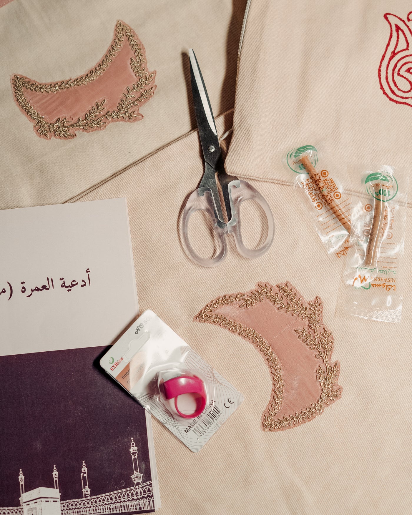 A compact Umrah kit that includes a prayer mat, dua booklet, athkar counter, miswak, and scissor — all the essentials you need for your spiritual journey in one convenient bag.