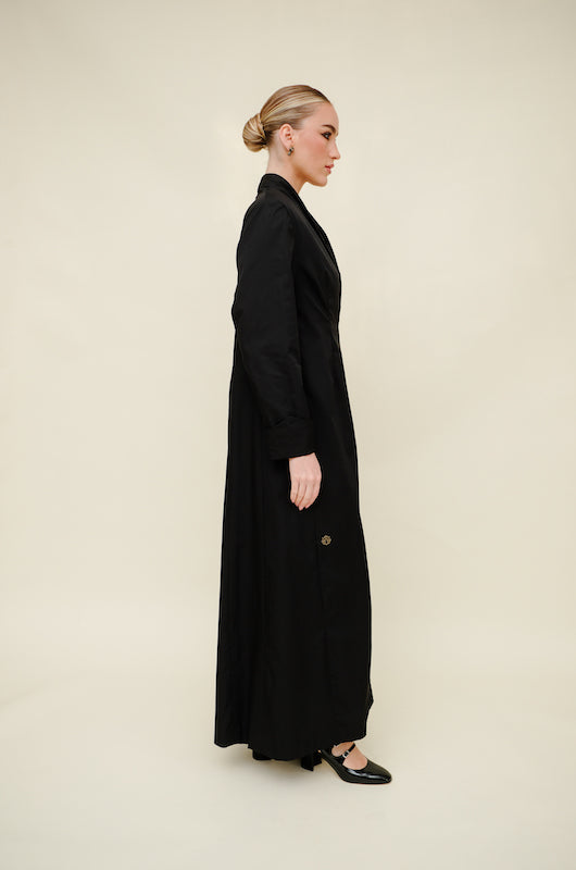A coat-style abaya in a breathable cotton blend —perfect for transitional weather with timeless elegance.