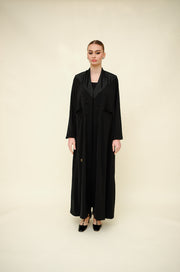 Elegant crepe abaya with a unique patterned neckline that adds a refined touch to the minimal silhouette.