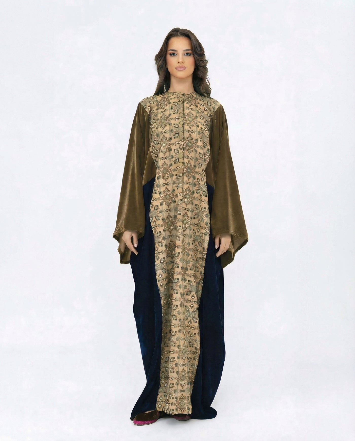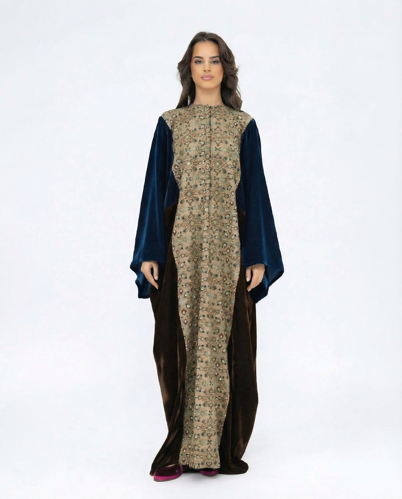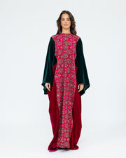 Embroidered rose silk beautifully paired with contrasting velvet, finished with intricately detailed buttons along the front for a refined, elegant statement.