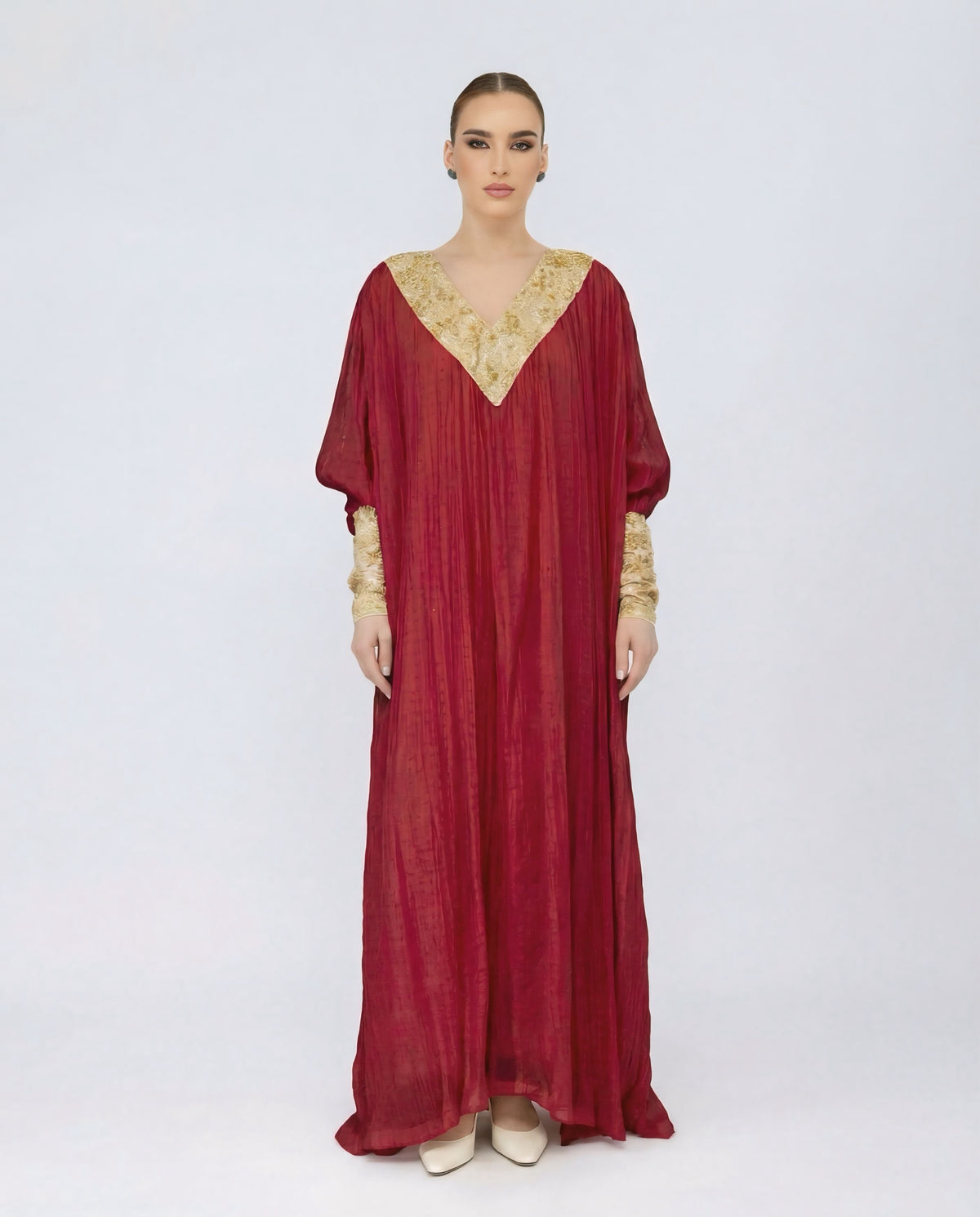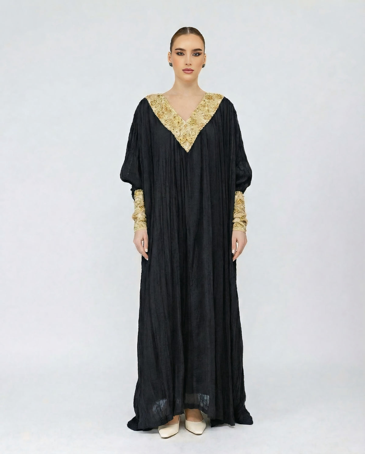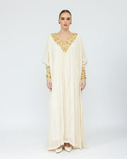 A lightweight crushed-fabric kaftan with a flowy silhouette, elevated by heavily embroidered sleeves and neckline for effortless sophistication.