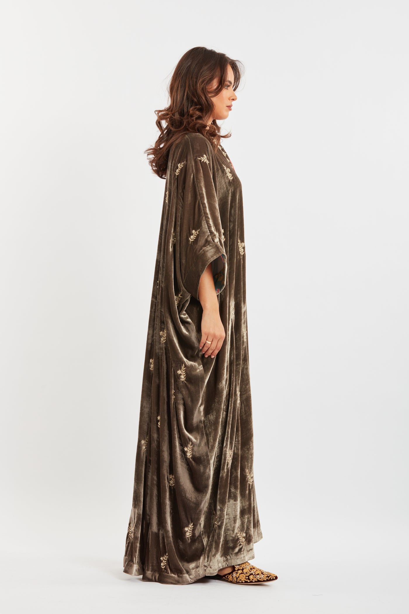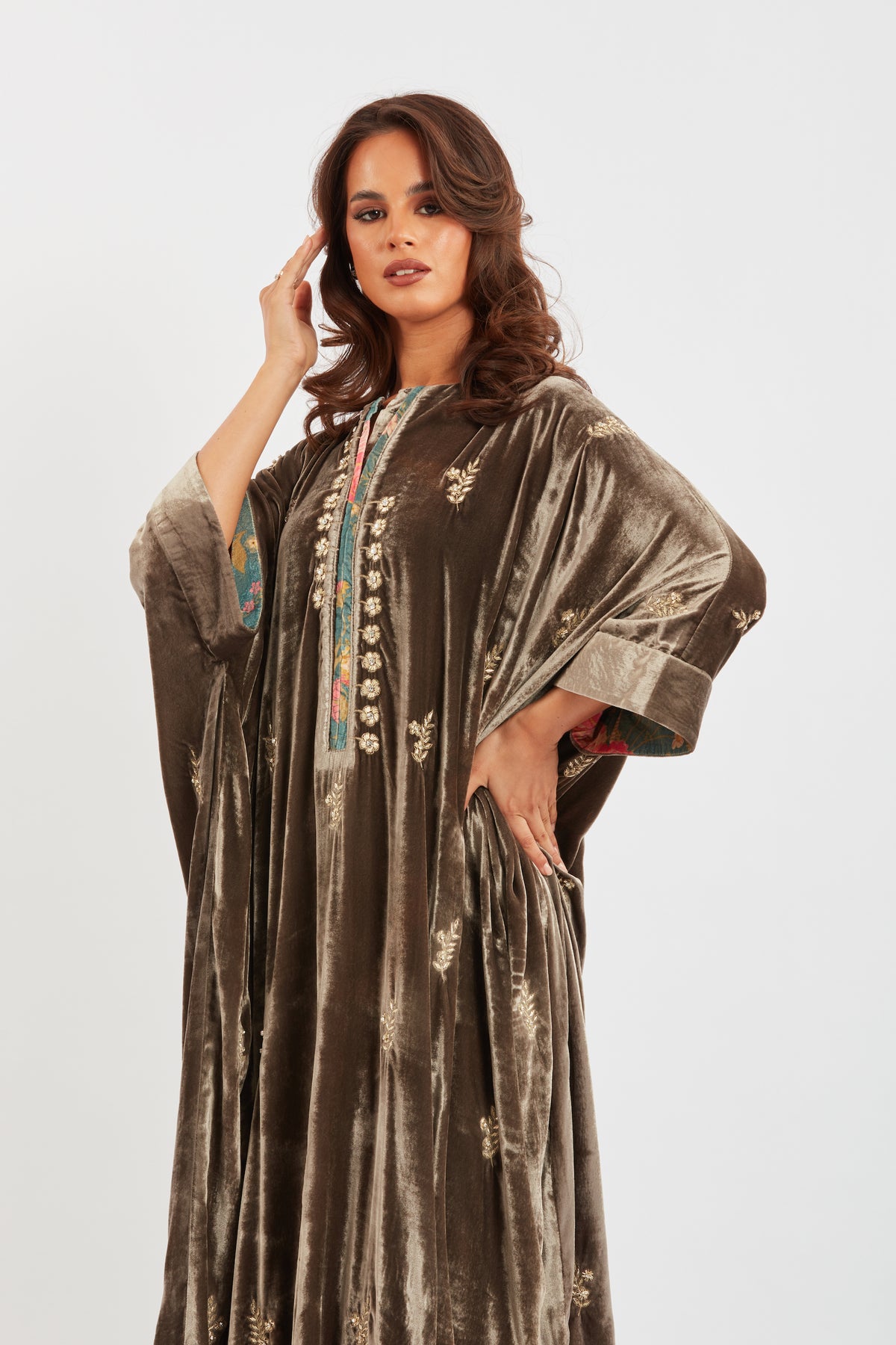 A velvet kaftan adorned with overall embroidered motifs and printed velvet detailing, radiating sophistication through its rich textures and refined artistry.