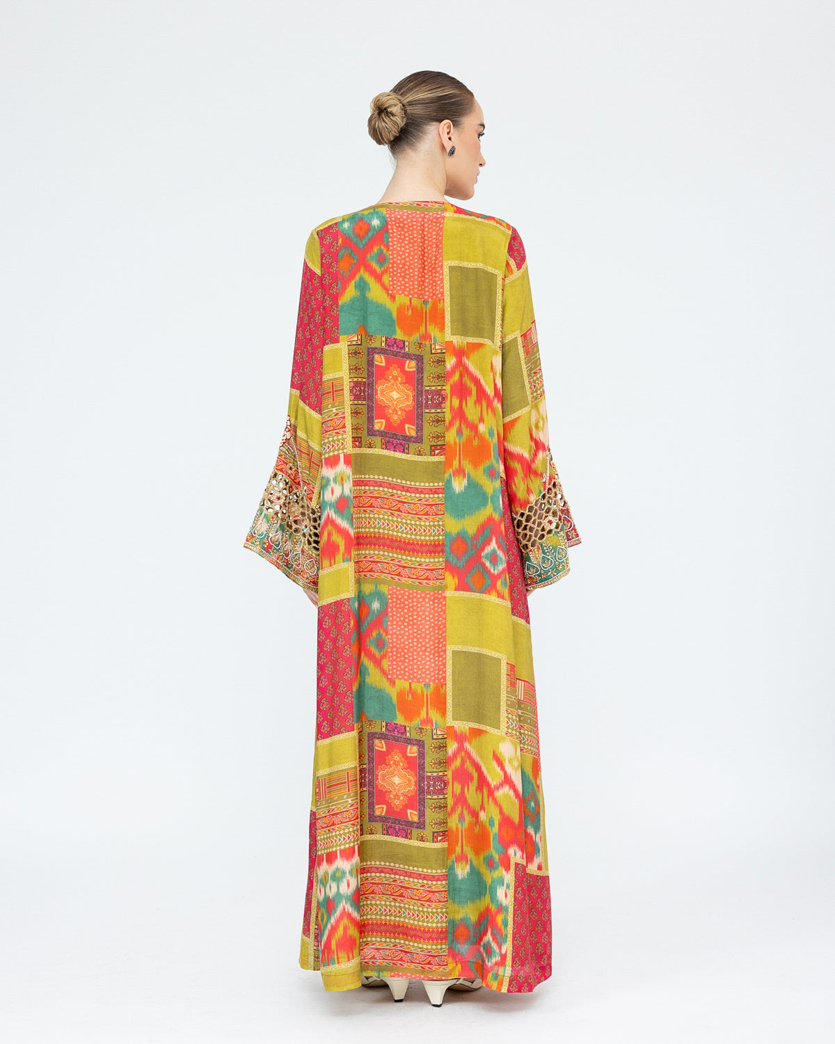 A printed kaftan highlighted with heavy embroidery along the neckline. The look is finished with intricate cutwork detailing on the sleeves, adding texture and refined craftsmanship.