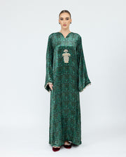 A printed velvet kaftan featuring a striking front motif and delicate mirrorwork detailing on the sleeves, blending rich textures with artisanal charm.