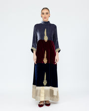 A multicolor kaftan crafted with velvet and silk panels, adorned with elegant motifs for a striking, artful finish. The blend of rich textures and vibrant hues creates a luxurious silhouette that’s perfect for special occasions.