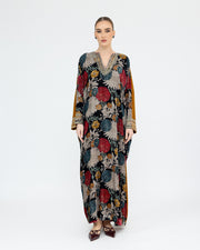 A printed velvet kaftan enriched with intricate embroidery along the neckline and sleeves, blending detailed craftmanship withtimeless elegance.
