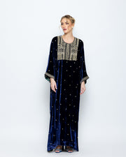 This Navy Blue Velvet Kaftan is opulent, with embroidered details on the body and sleeves.
