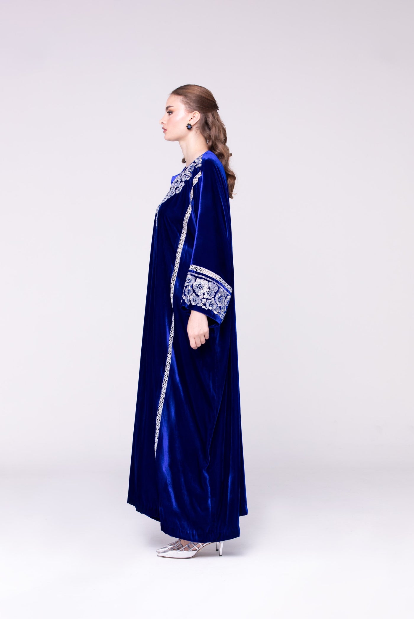 Silk velvet Kaftan with elegant embroidered necklineand lace details.