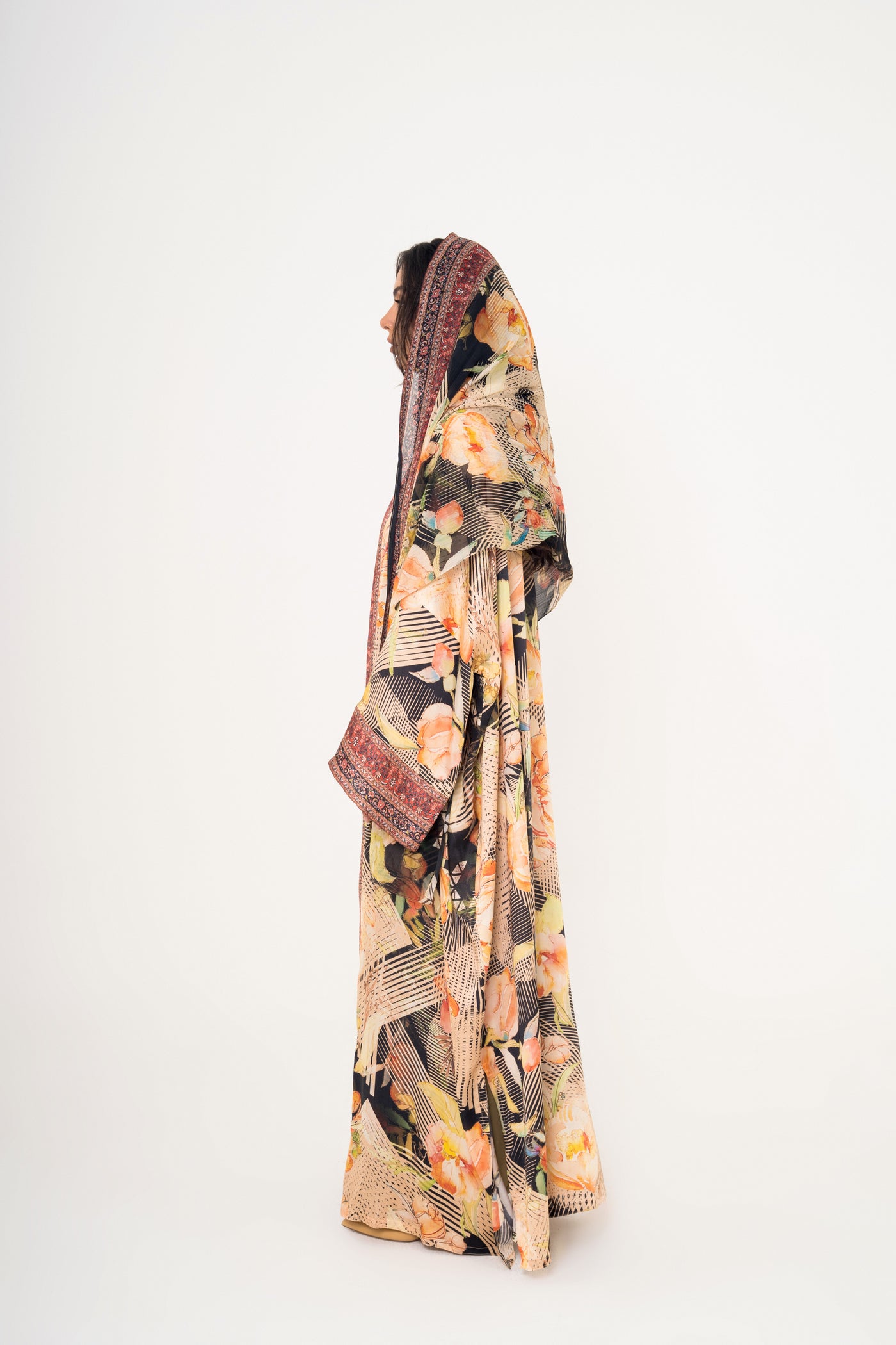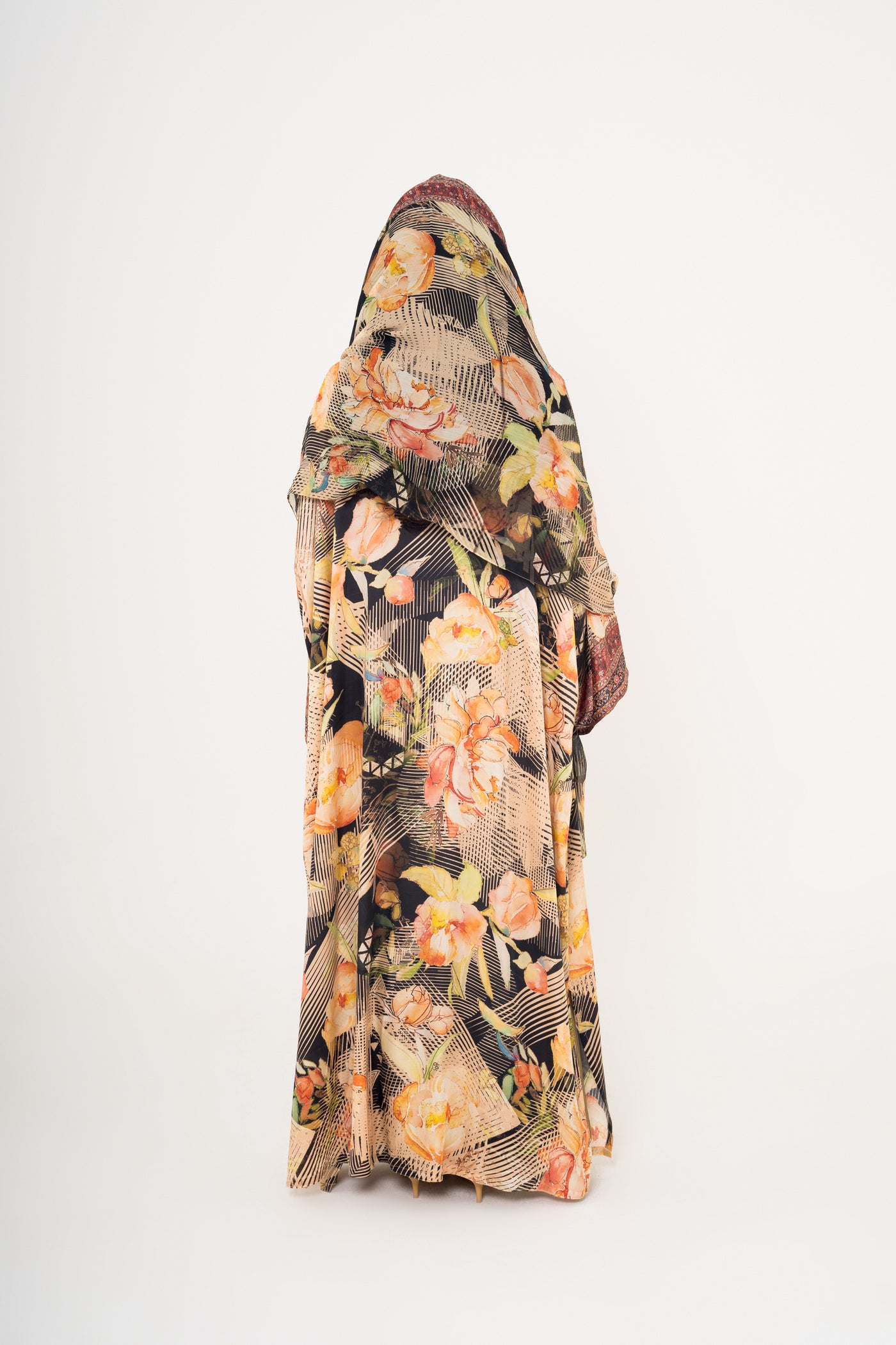A dreamy floral printed abaya that flows effortlessly, paired with a matching chiffon Sheila. The satin silk fabric drapes beautifully, creating a fluid and refined aesthetic.