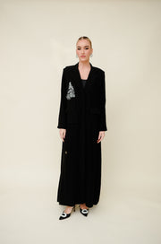 Blazer-cut abaya with an elegant embroidery panel — a sophisticated piece for modern wardrobes.
