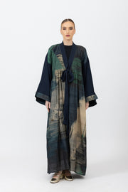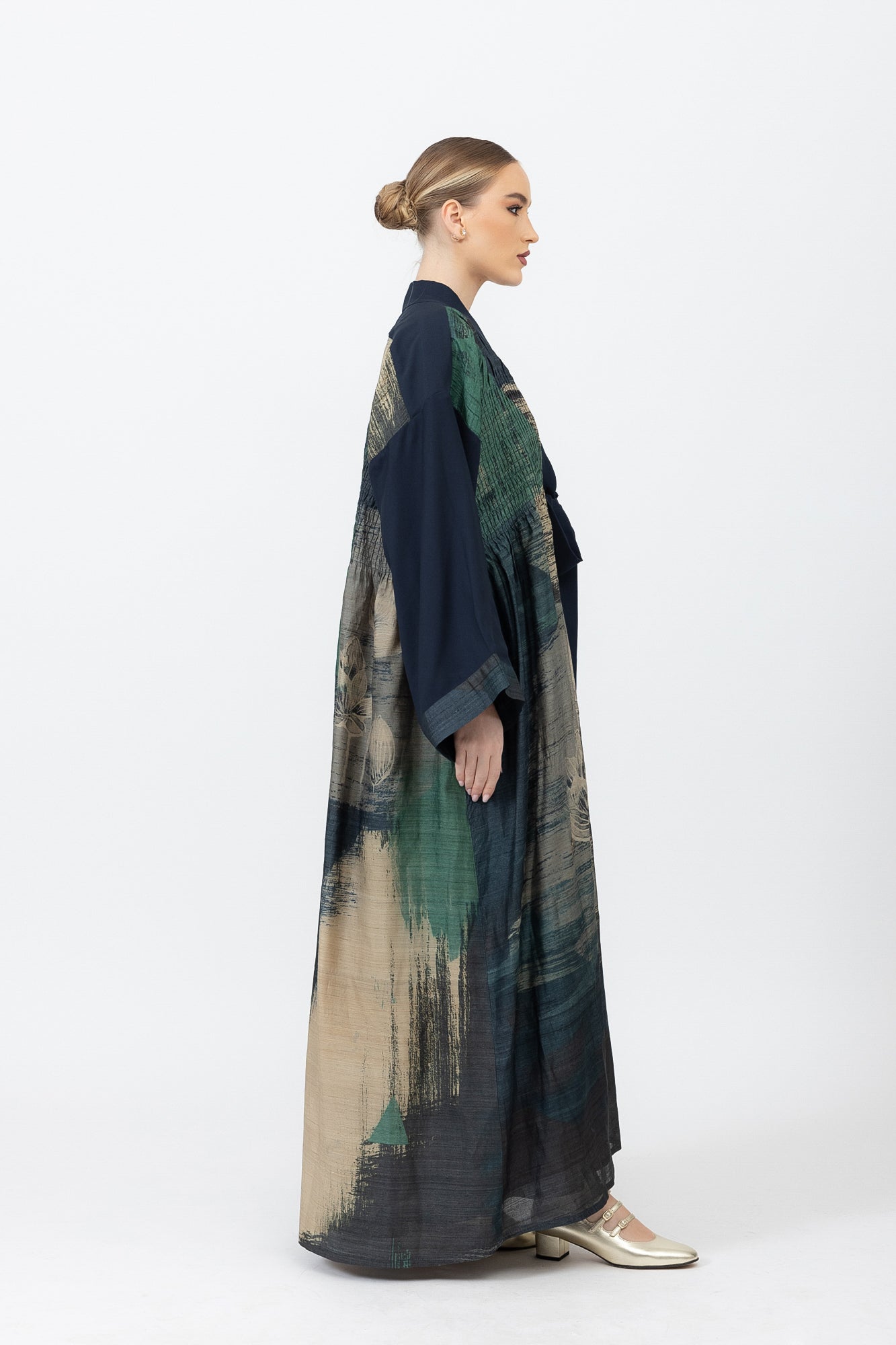 A sophisticated printed abaya with delicate gathering details and a chic bow tie neckline, offering a balance of structure and fluidity in a silk-crepe blend.