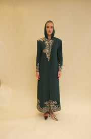 Elevated with intricate zari detailing, this coat-style abaya is tailored from twill georgette for graceful structure.