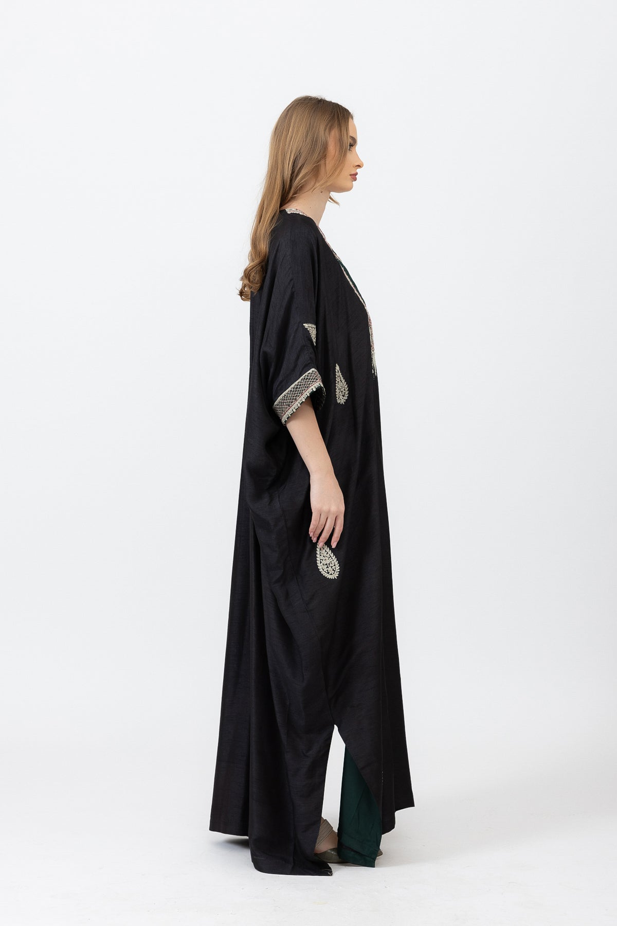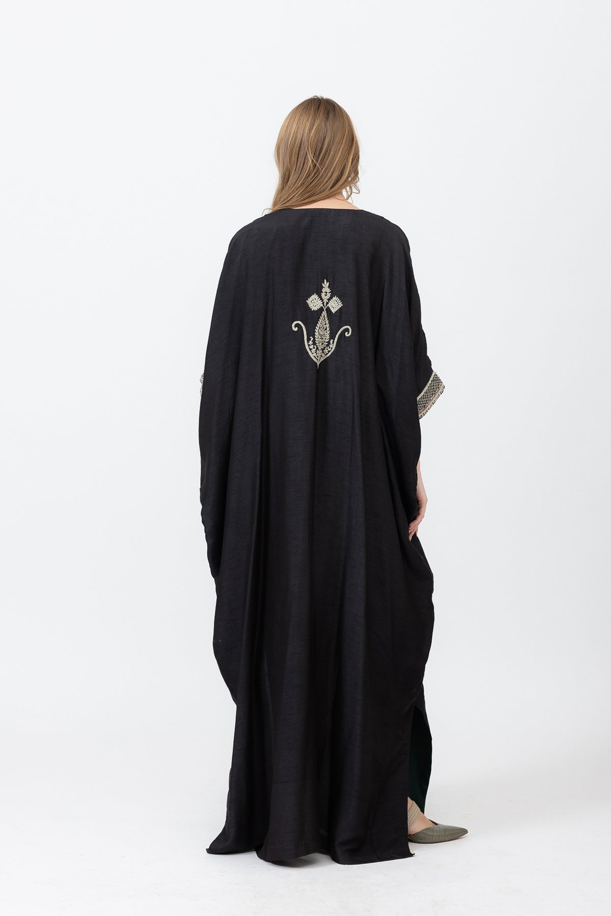 An effortlessly elegant silk kaftan adorned with intricate embroidery, exuding timeless sophistication and grace.
