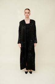 Full embroidered satin silk abaya — a luxurious statement piece for elegant evenings.