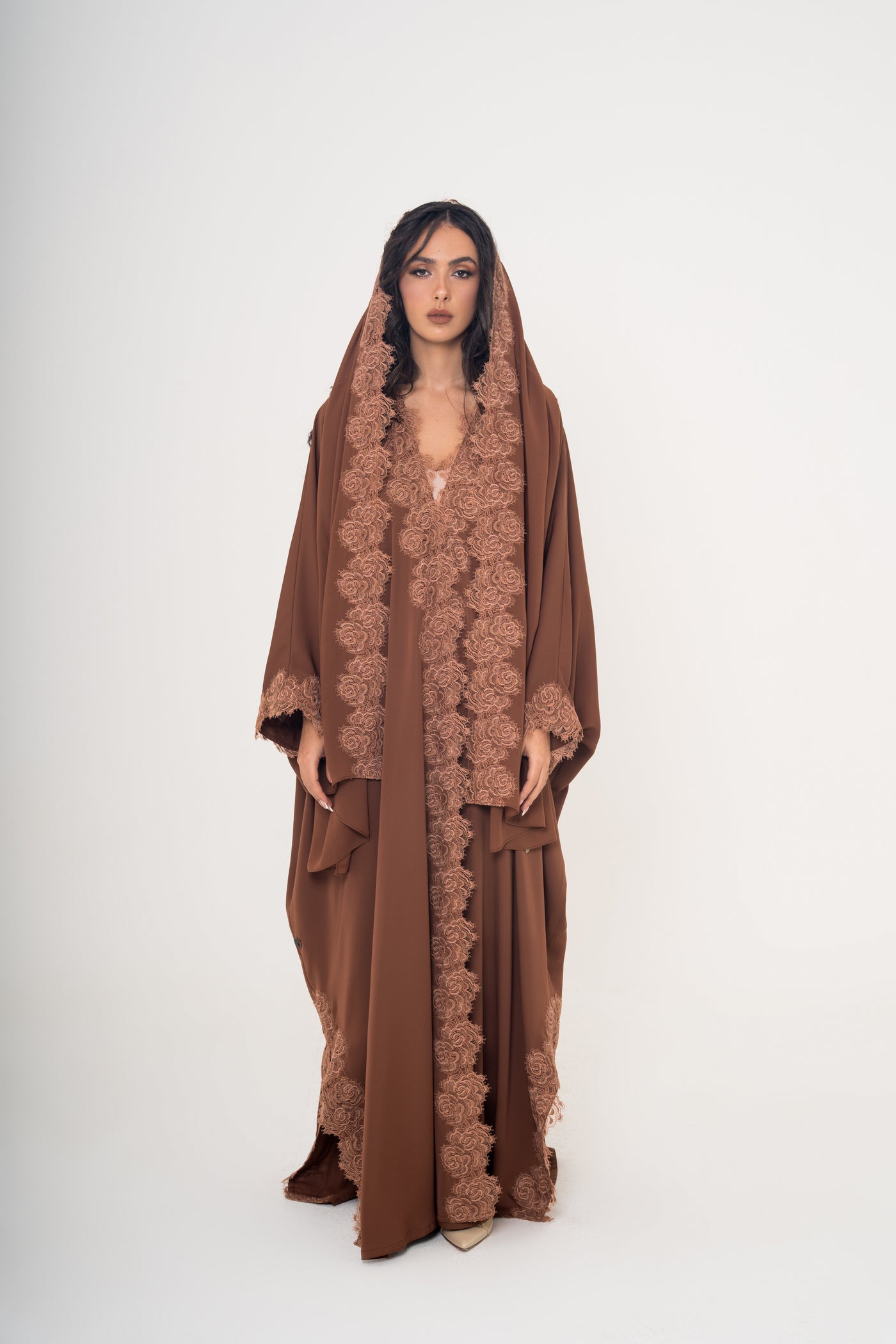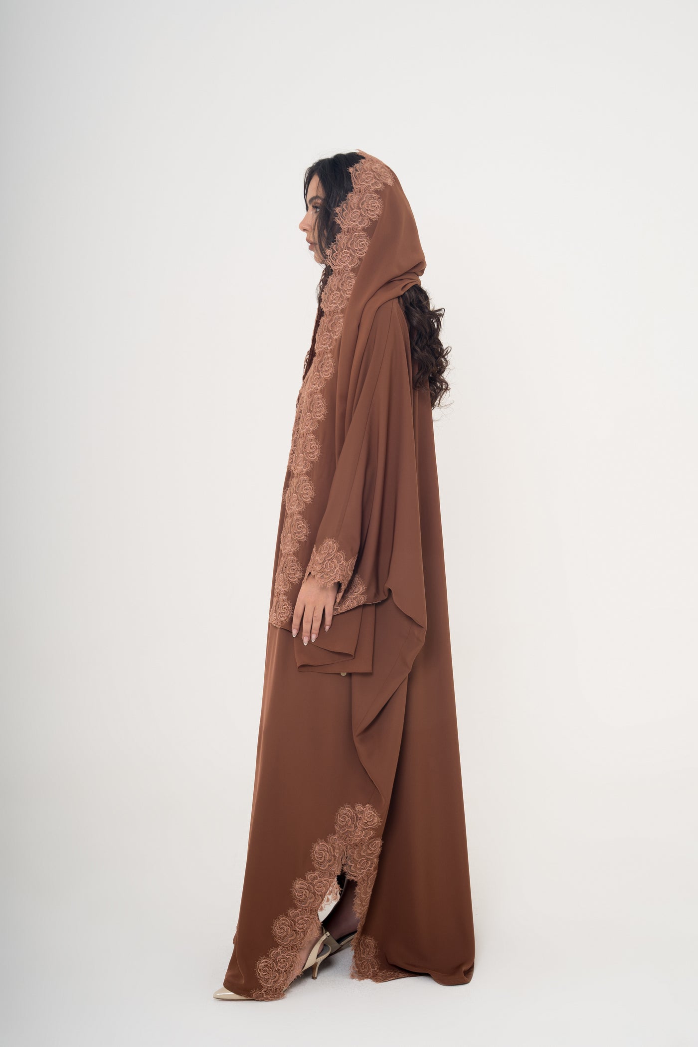 This graceful crepe abaya is adorned with intricate floral lace, creating a timeless balance between modesty and femininity.