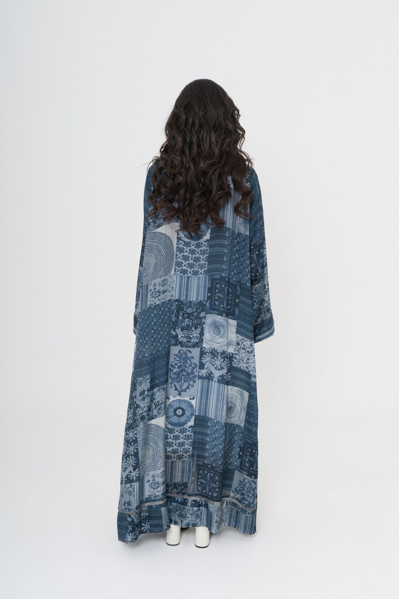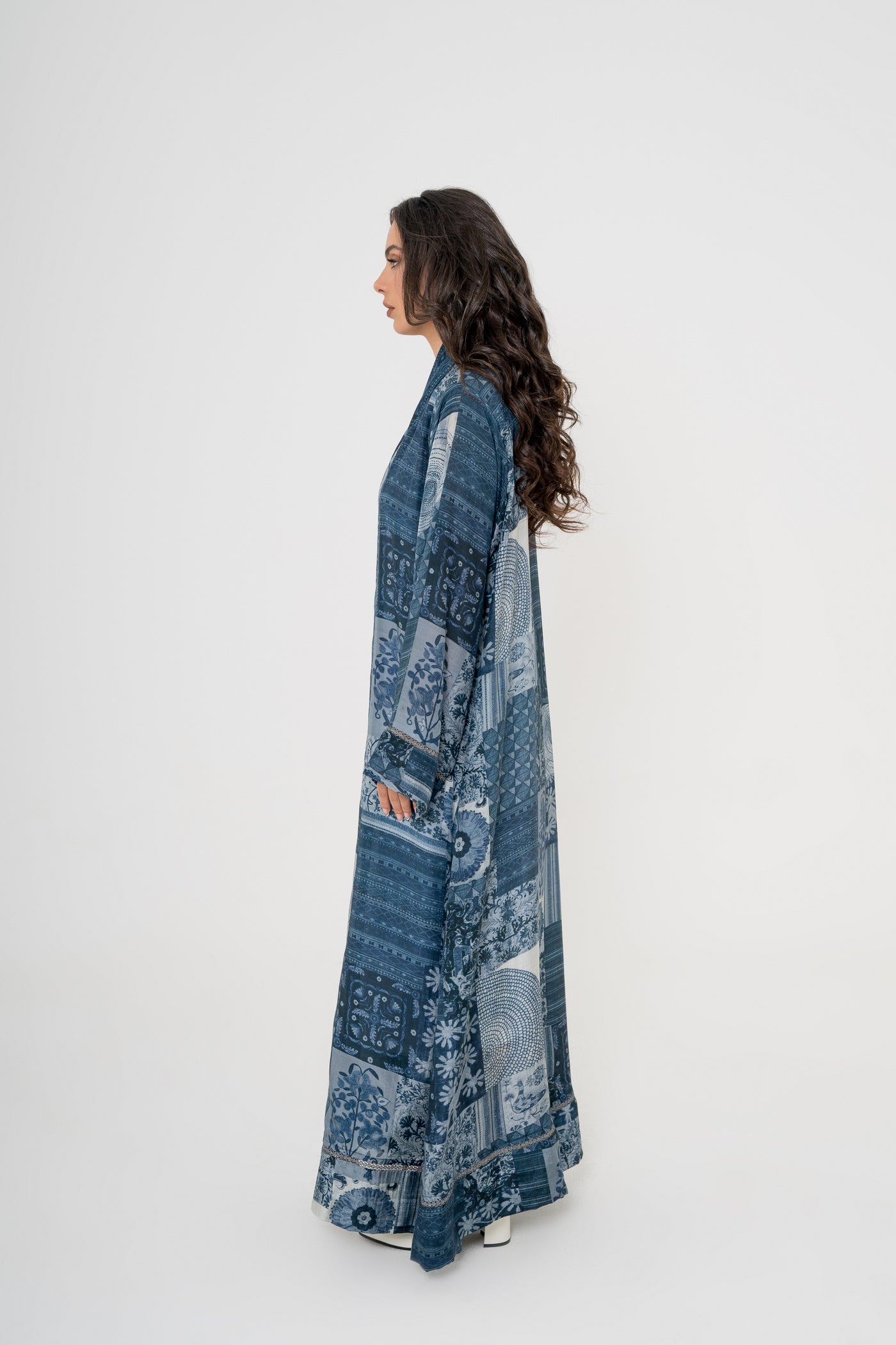 An ethereal blue printed abaya delicately finished with silver lace detailing — refined, radiant, and effortlessly elegant.