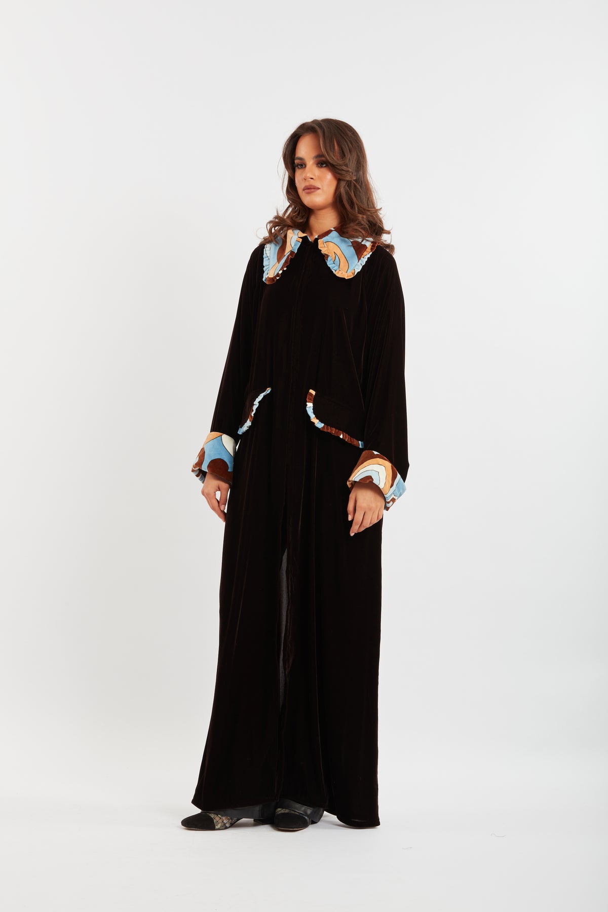 A flowy jacket-style abaya detailed with printed velvet on the collar and sleeves, creating a harmonious balance of texture and movement.