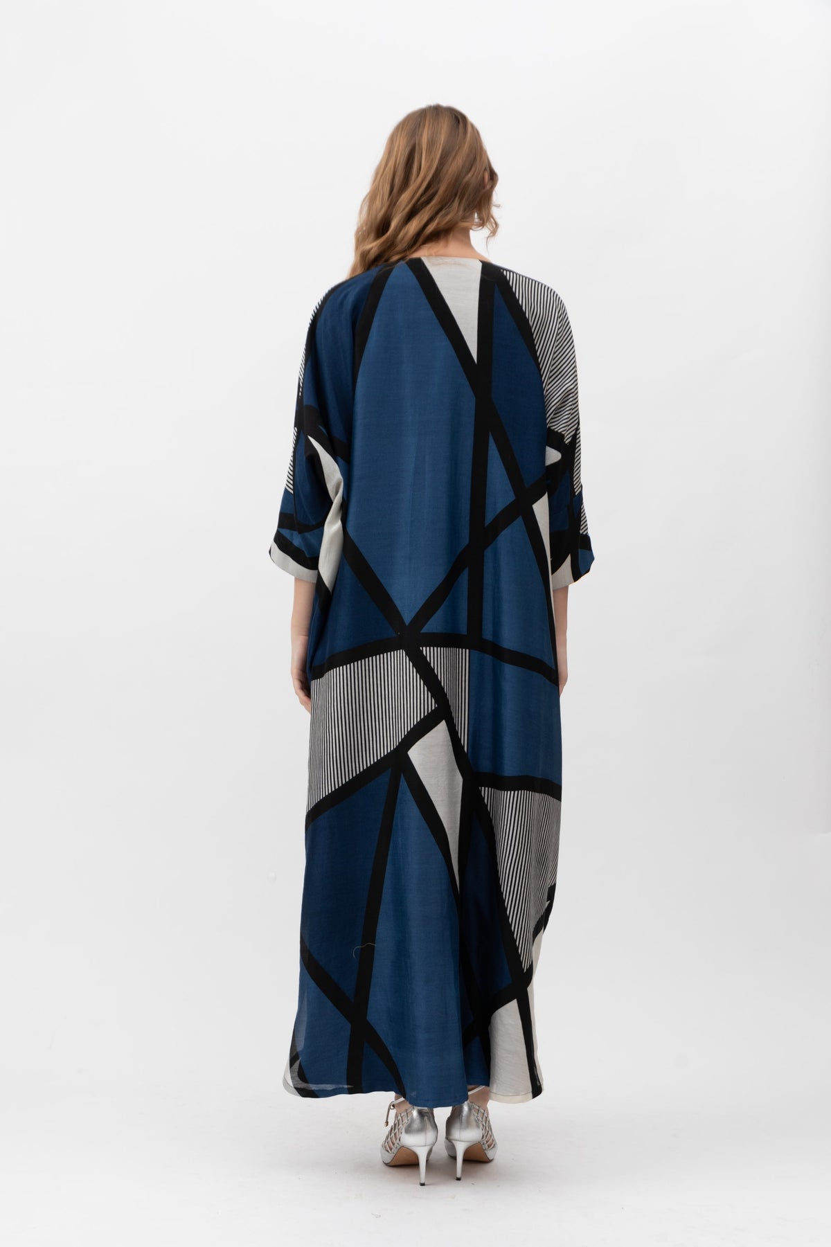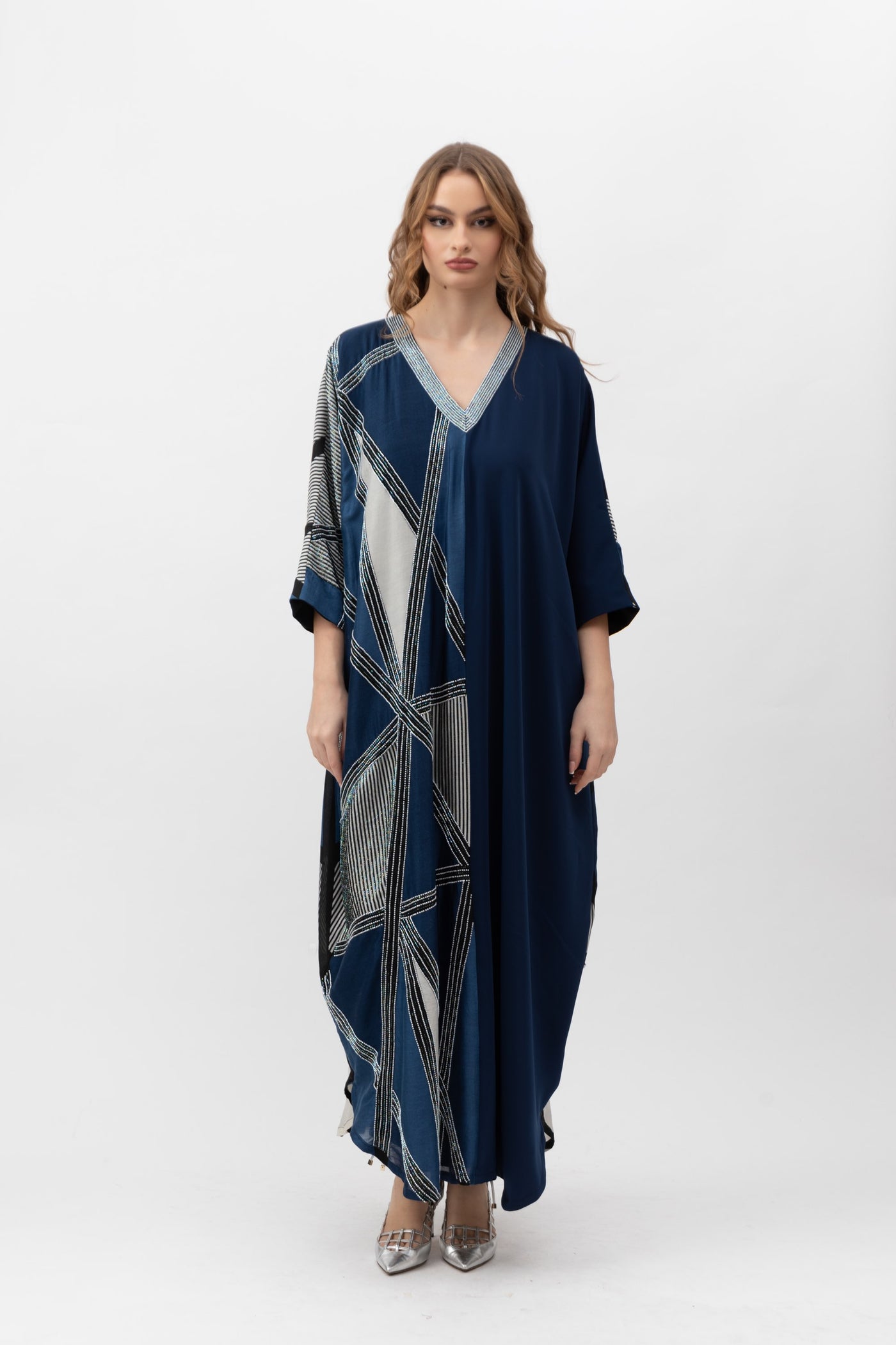 Blue cotton/crepe kaftan with striking geometric embroidered details, blending modern design with classic comfort.