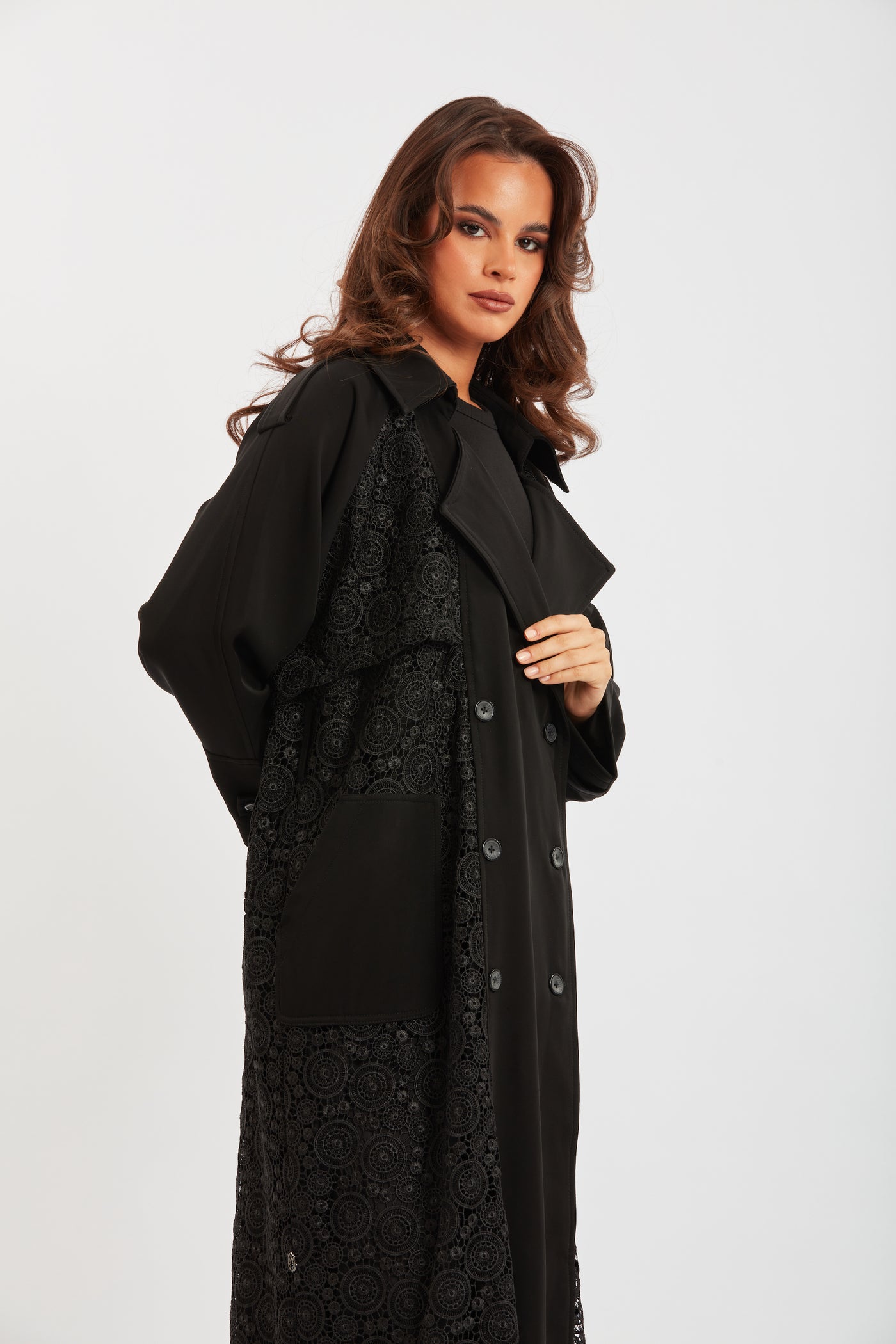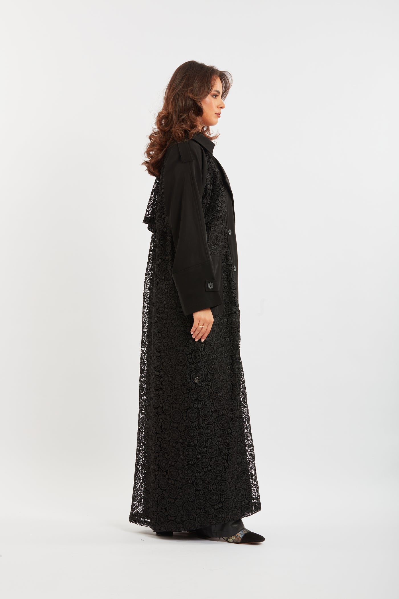 A sophisticated lace-combination abaya featuring panel detailing on the back and delicate button accents.