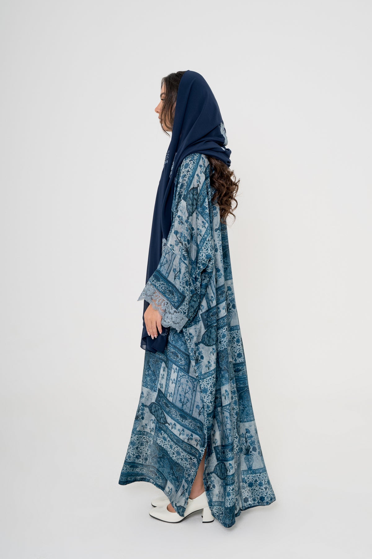 A serene blend of blue tones complemented by gray lace, offering timeless elegance with a touch of artistic detail.