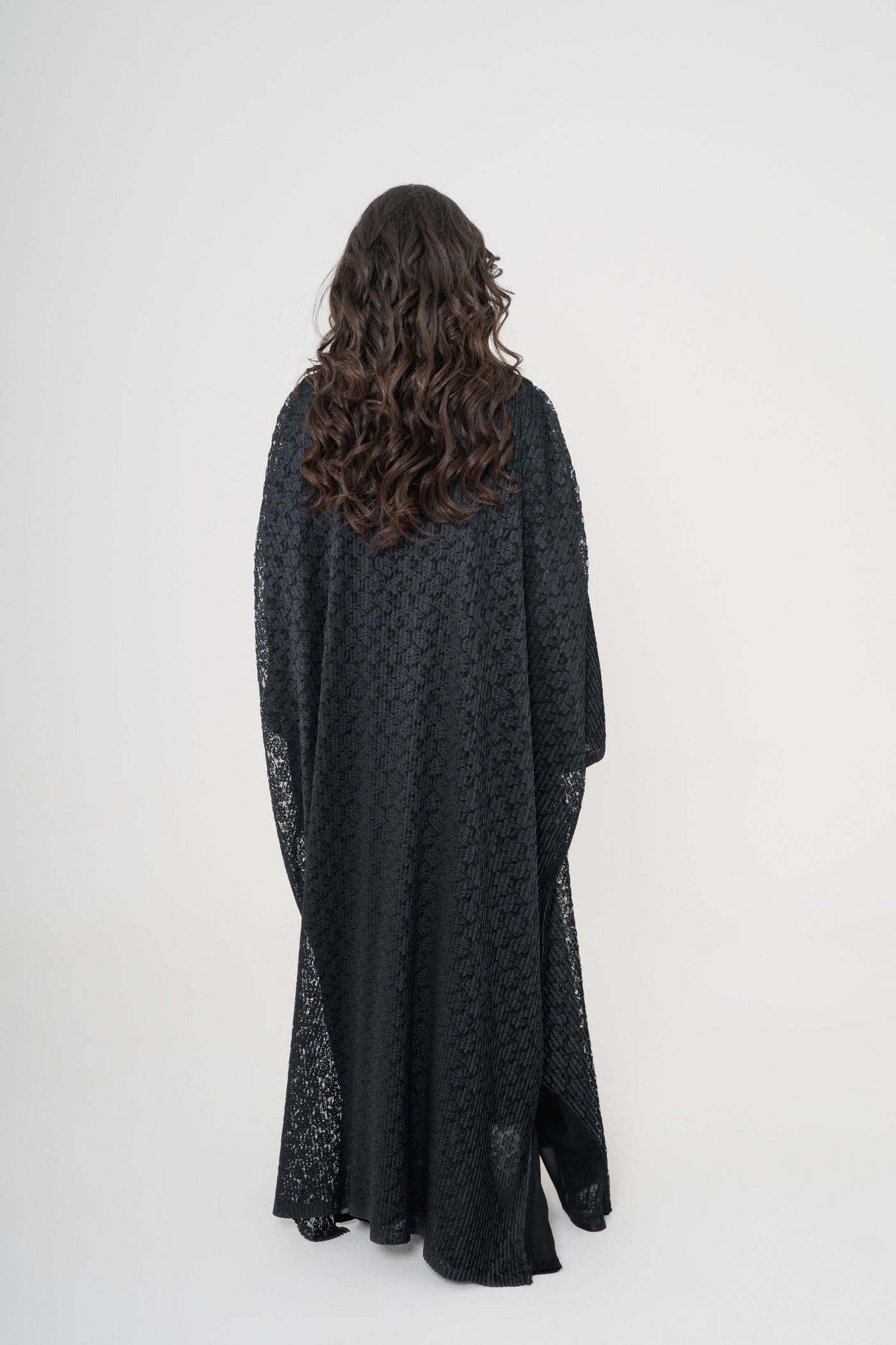 A graceful abaya designed with flowing pleats and intricate lace details, offering a soft, feminine drape that elevates any look with refined charm.