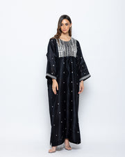 The Black Raw Silk Kaftan is a luxurious staple for your wardrobe. Detailed embroidery work across the body and sleeves adds a touch of elegance to the piece.
