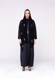 Tafta wrap around coat style abaya with Zari button details and embroidered Zari Sheila.