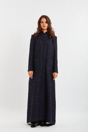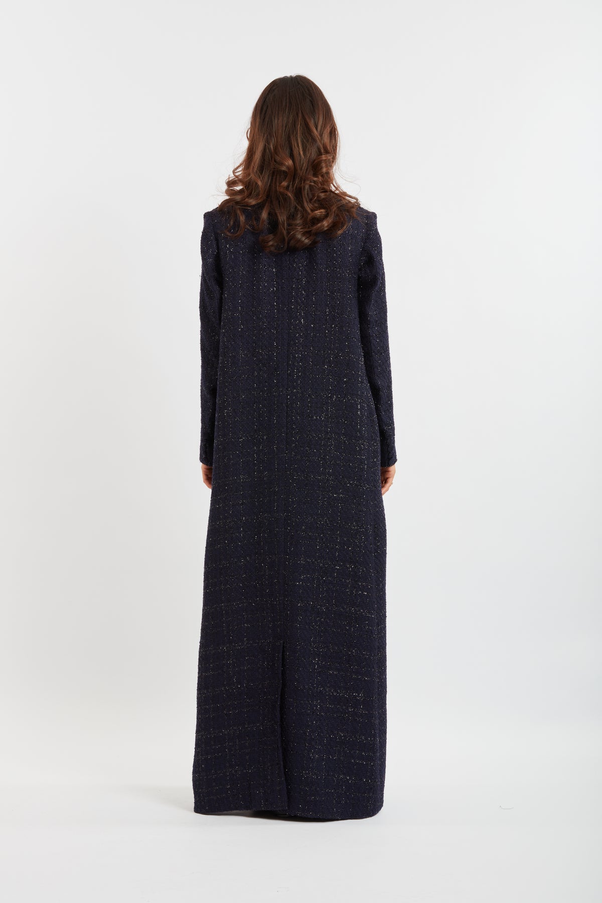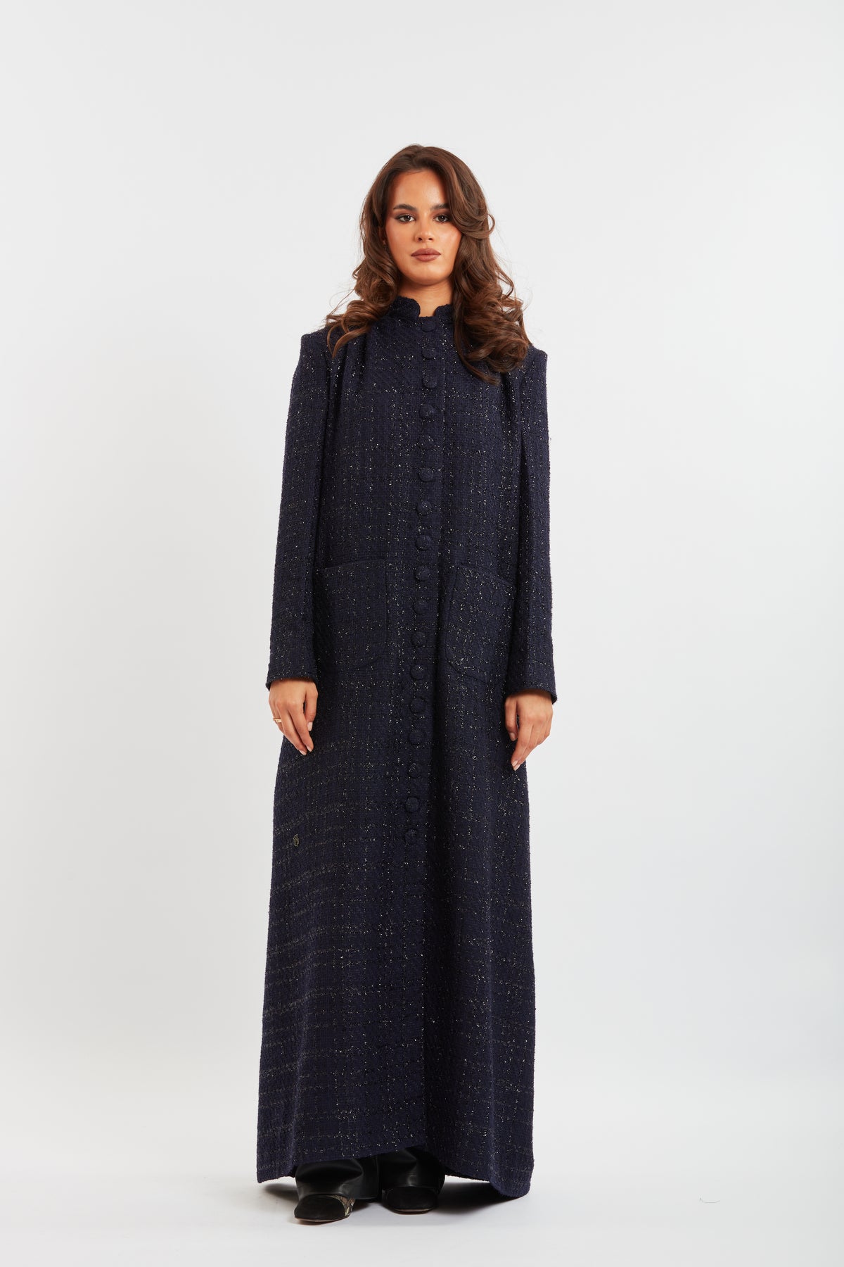 A tailored tweed abaya featuring button accents and functional pockets, blending classic sophistication with modern practicality.