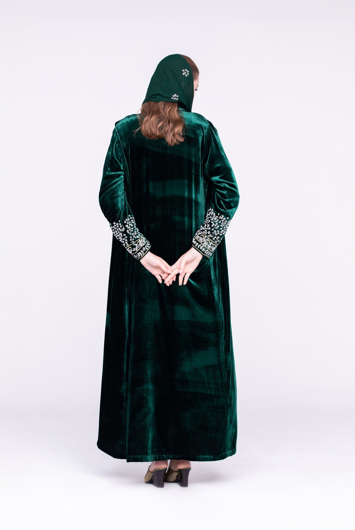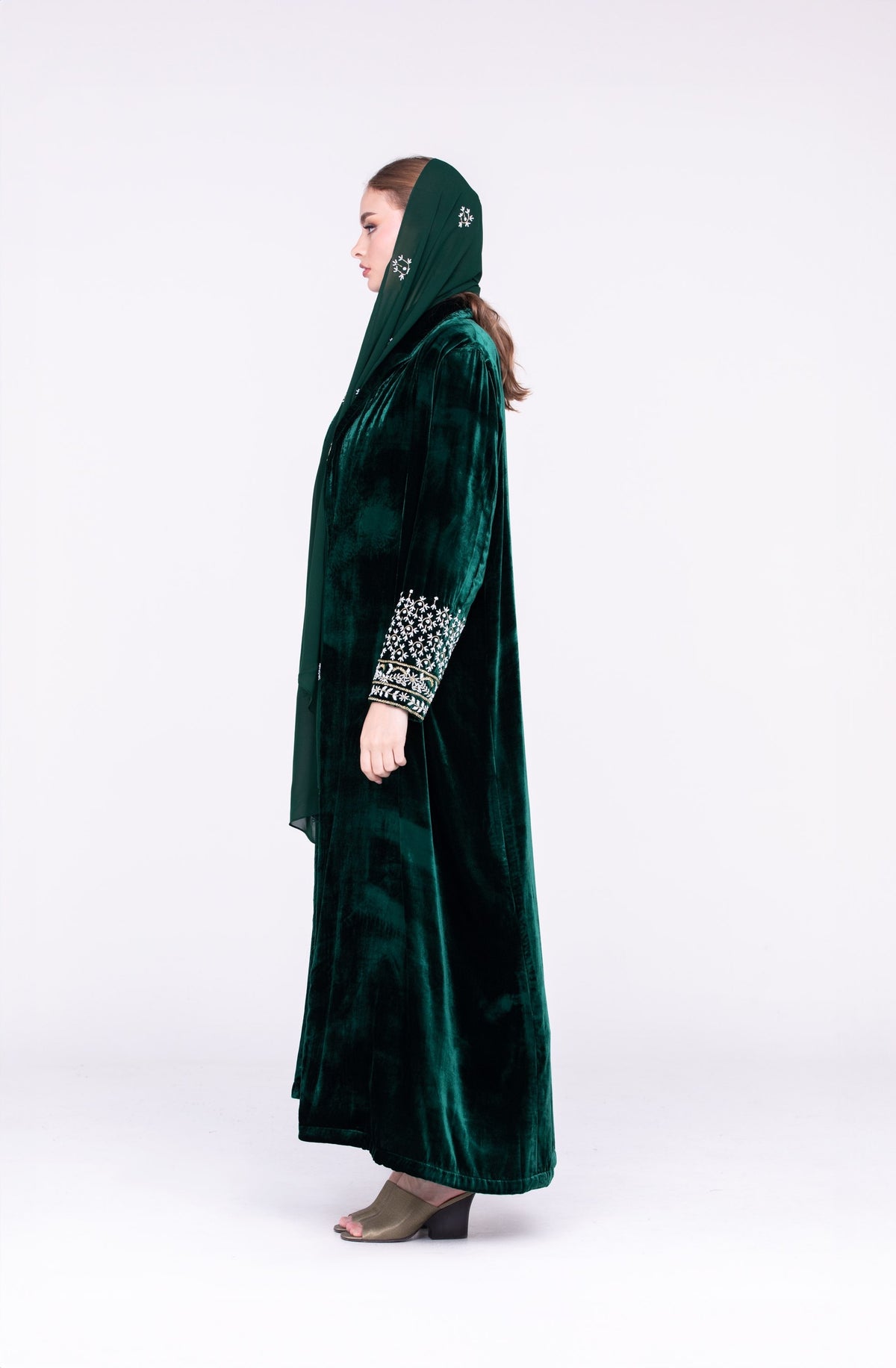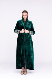 Velvet Blazer-cut abaya with embroidered sleeve details.