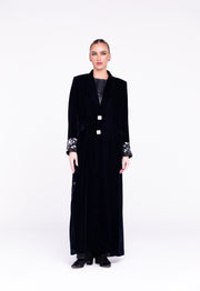 Silk velvet abaya with embroidered sleeve details.