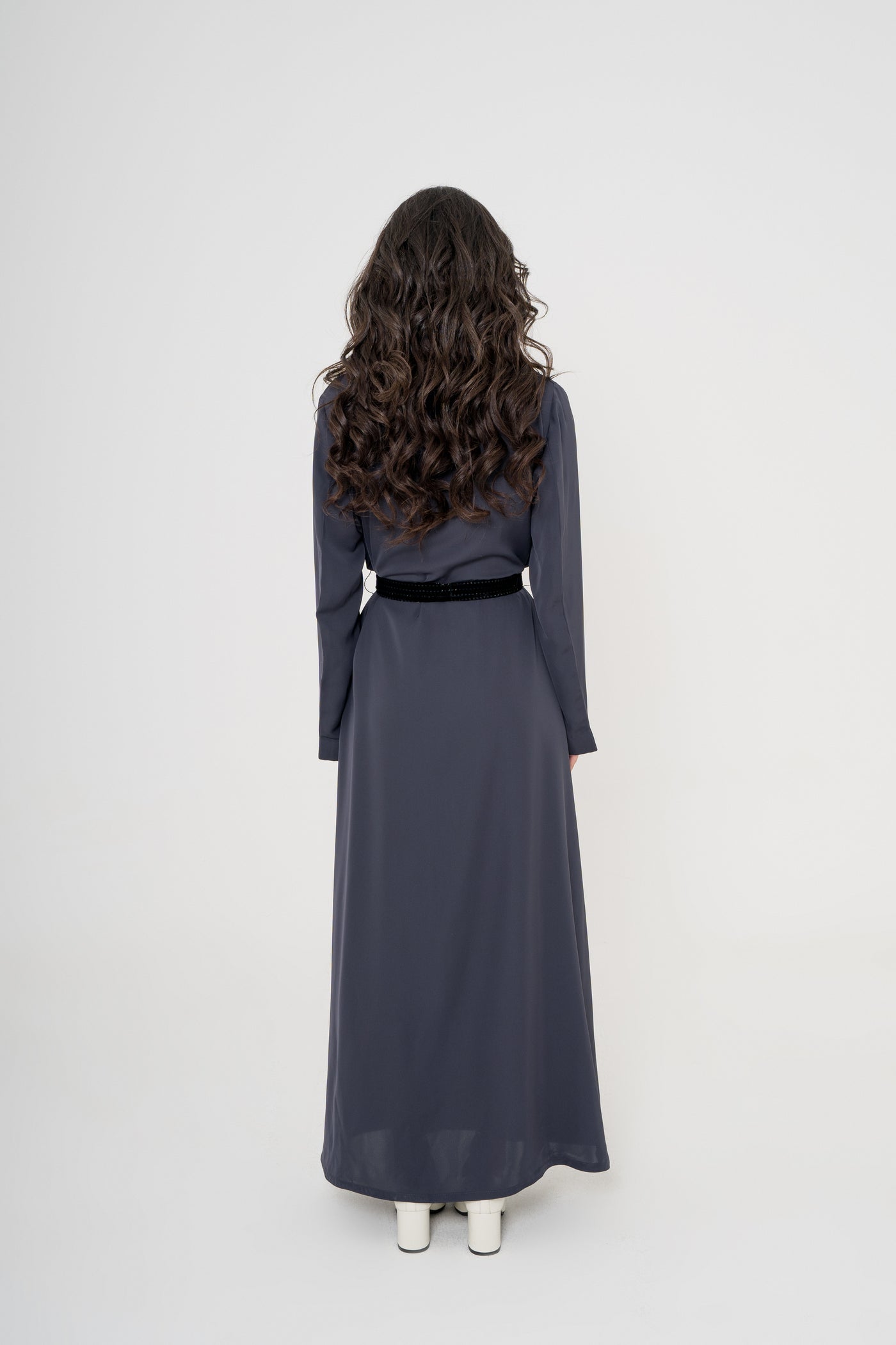 Crafted from silk crepe, this gray abaya features a plush velvet collar and a matching belt for a tailored, polished look that defines understated luxury.